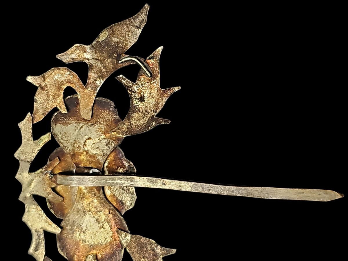 Condition is consistent with age and material. There is visible feather loss, edge wear, and surface variation, particularly along raised and openwork areas. These characteristics are typical and expected in genuine antique tian-tsui jewelry due to the fragile nature of kingfisher feather inlay. The structure remains sound and the piece presents with strong overall visual impact.