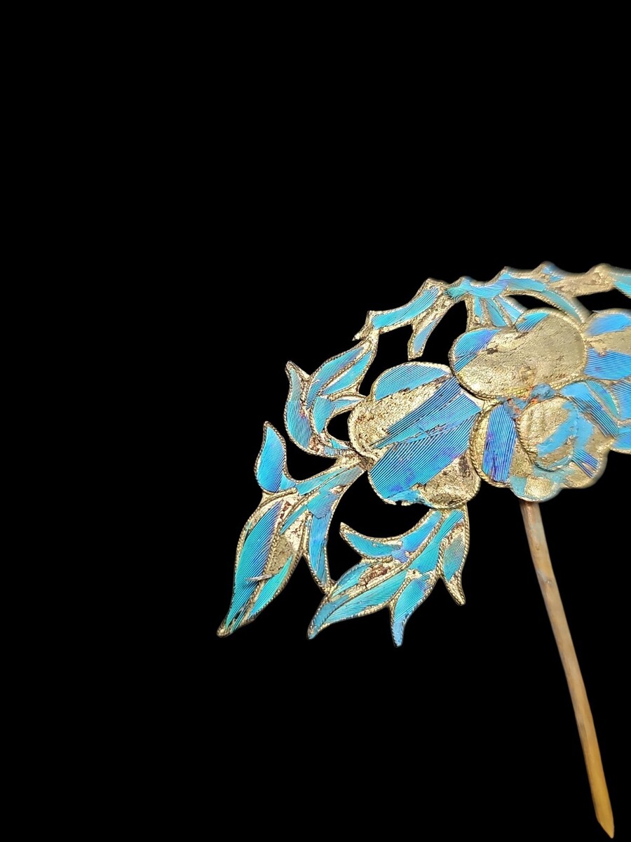 The featherwork displays the characteristic directional striation and color depth unique to authentic tian-tsui and is clearly distinct from enamel or modern imitations. The reverse shows traditional construction with a long hair pin shaft, consistent with early 20th century Chinese decorative hair ornaments, circa 1900?1915.