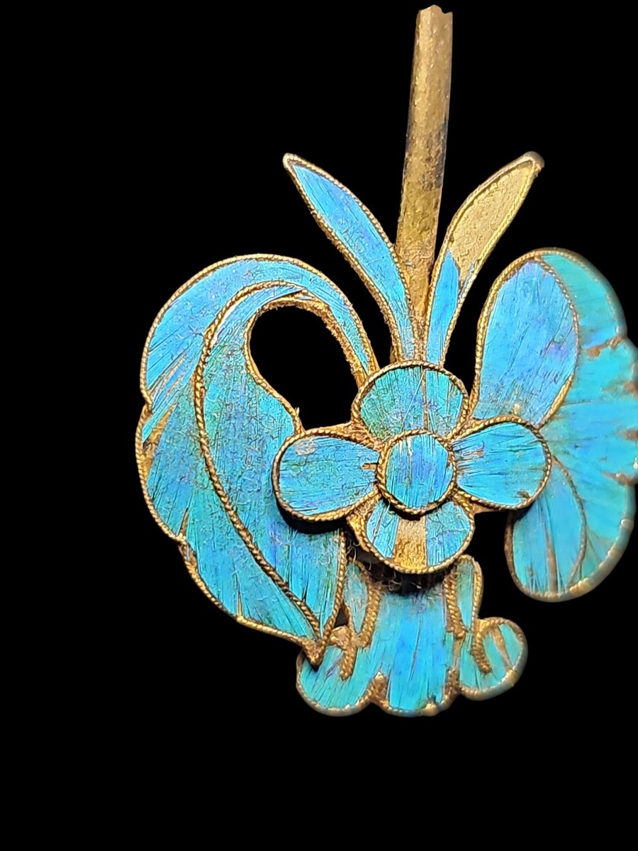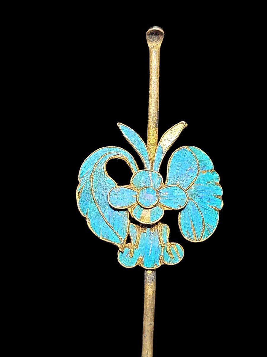 The featherwork displays the characteristic directional striation and color depth unique to authentic tian-tsui and is clearly distinct from enamel or modern imitations. The reverse shows traditional construction with a long hair pin shaft, consistent with early 20th century Chinese decorative hair ornaments, circa 1900?1915.