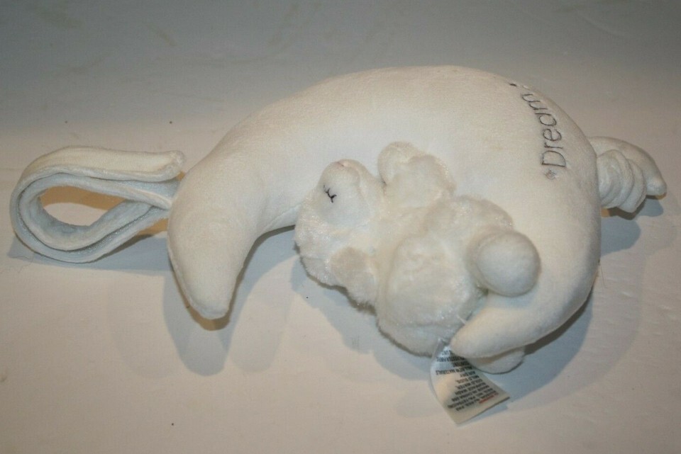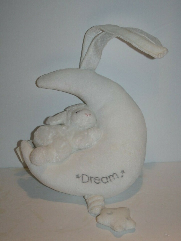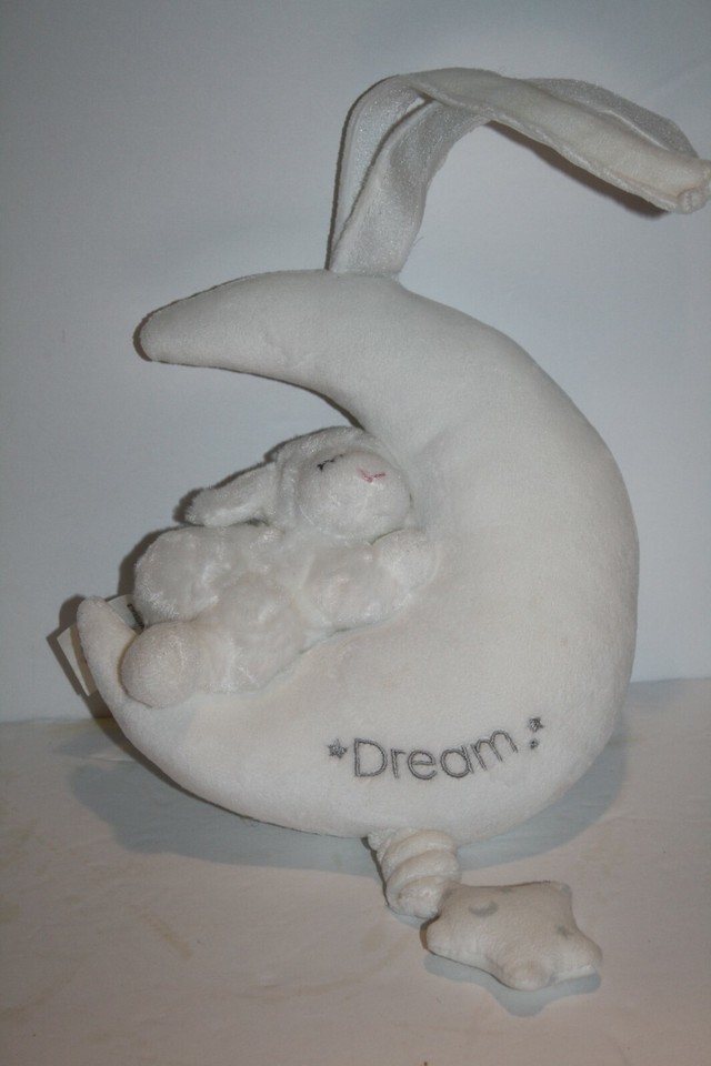 Features: Very Buttery soft plush material, All sewn features, Sound unit in moon, Star pull string for music, Winky Lamb attached to Crescent Moon, "Dream" and Stars embroidered on moon, Plush hanger with Hook and Loop tape on top of moon to attach to crib, seam tag intact