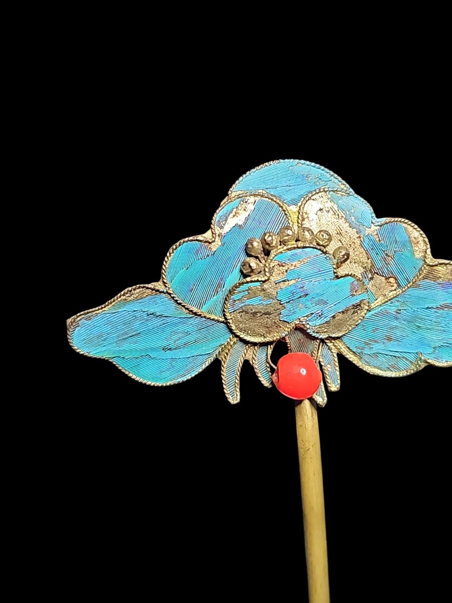 The featherwork displays the characteristic directional striation and color depth unique to authentic tian-tsui and is clearly distinct from enamel or modern imitations. The reverse shows traditional construction with a long hair pin shaft, consistent with early 20th century Chinese decorative hair ornaments, circa 1900?1915.