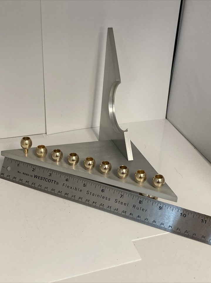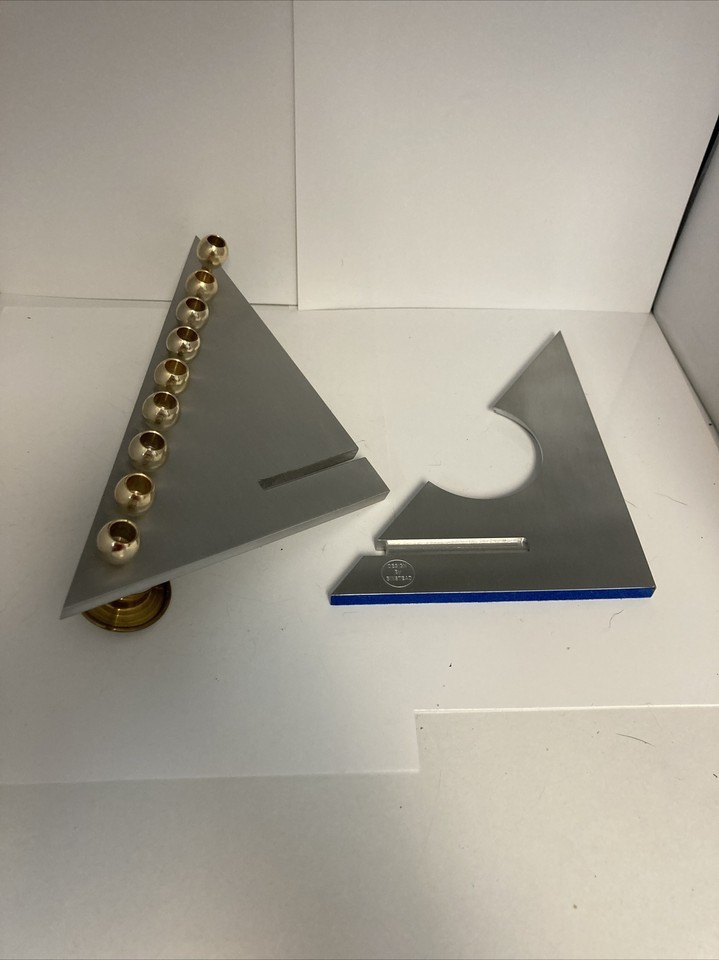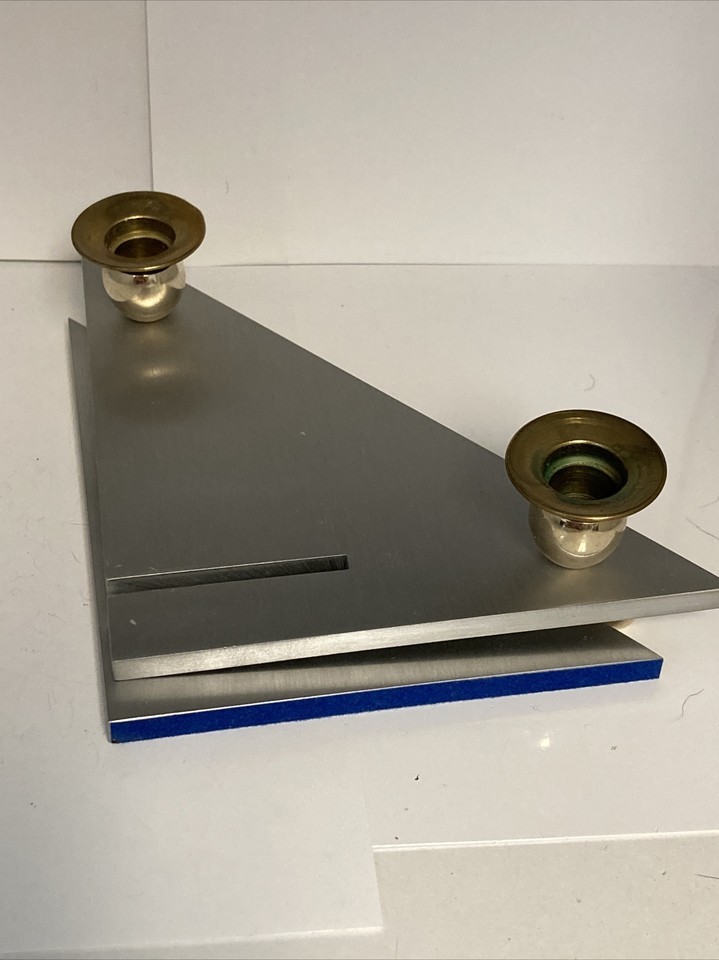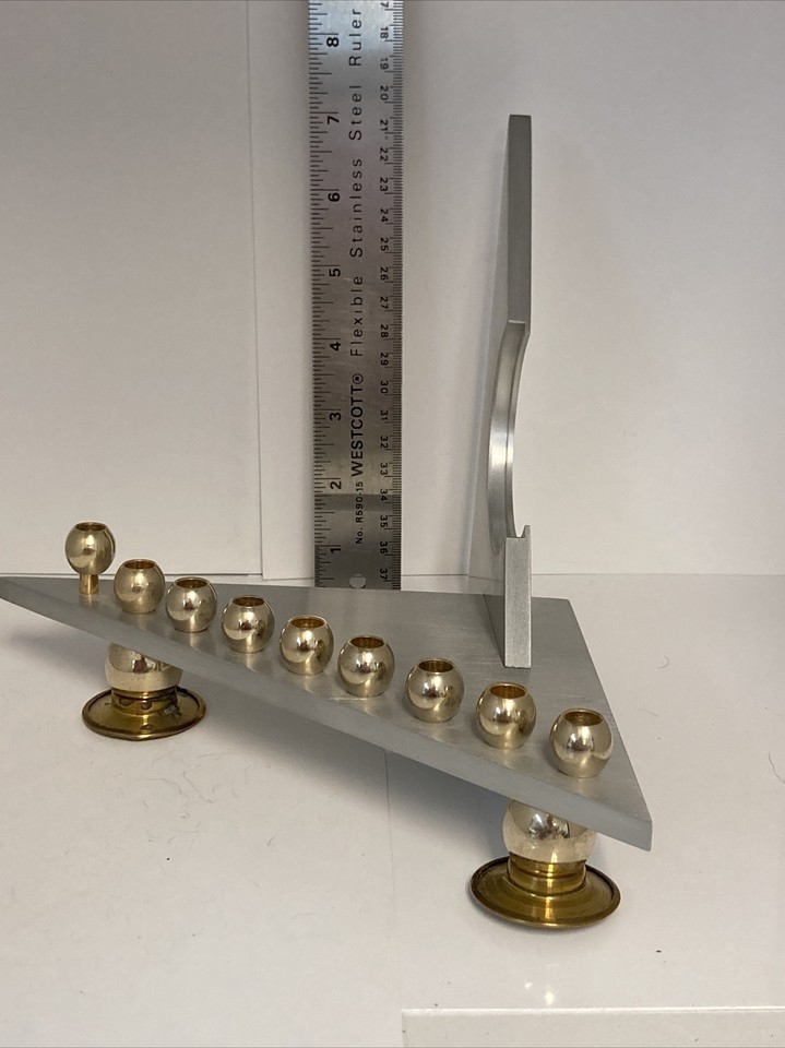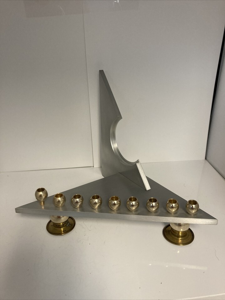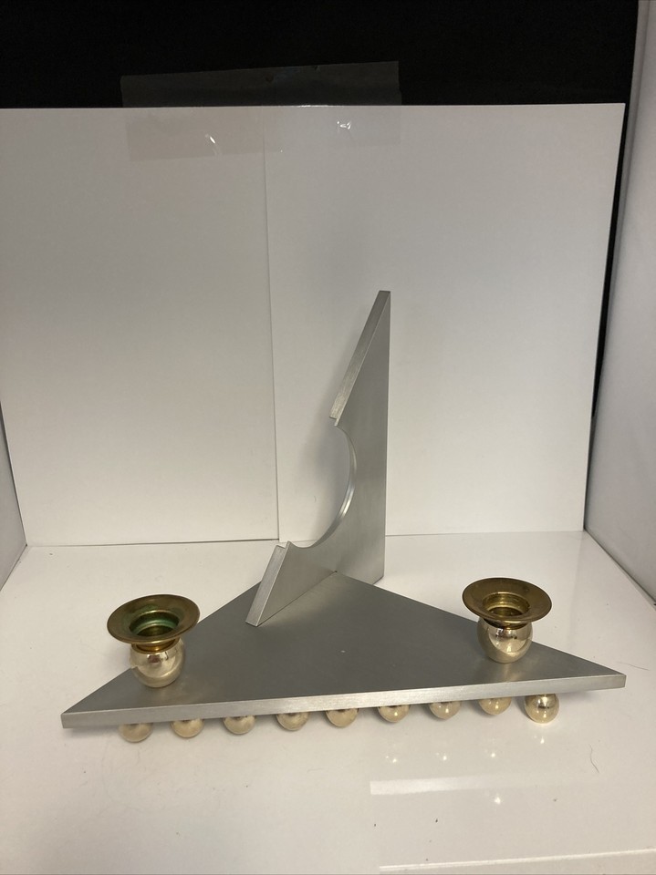 This was such a cool find! It was set up as a Chanukah menorah at the estate sale we found it. Realized the two parts slide out for easy storage or shipping and then realized the two foot underneath are actually a Shabbat Candlestick as well. Very well thought out and extremely modern looking with the stainless steel design sharp angle design.