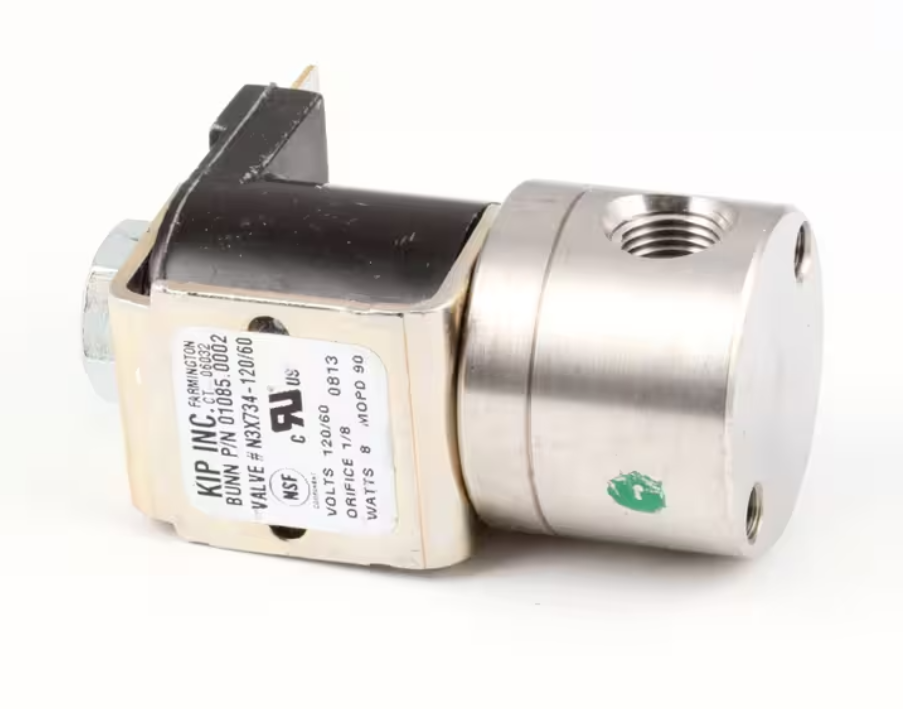 The Bunn 01085.0002 Solenoid Valve is a genuine OEM water control valve designed for Bunn automatic coffee brewers. Operating at 120V with a KIP configuration, this solenoid precisely controls water flow during the brew cycle, ensuring accurate fill volumes, consistent extraction, and reliable operation. Replacing a leaking or failed solenoid restores proper brewer performance and helps prevent water flow issues.