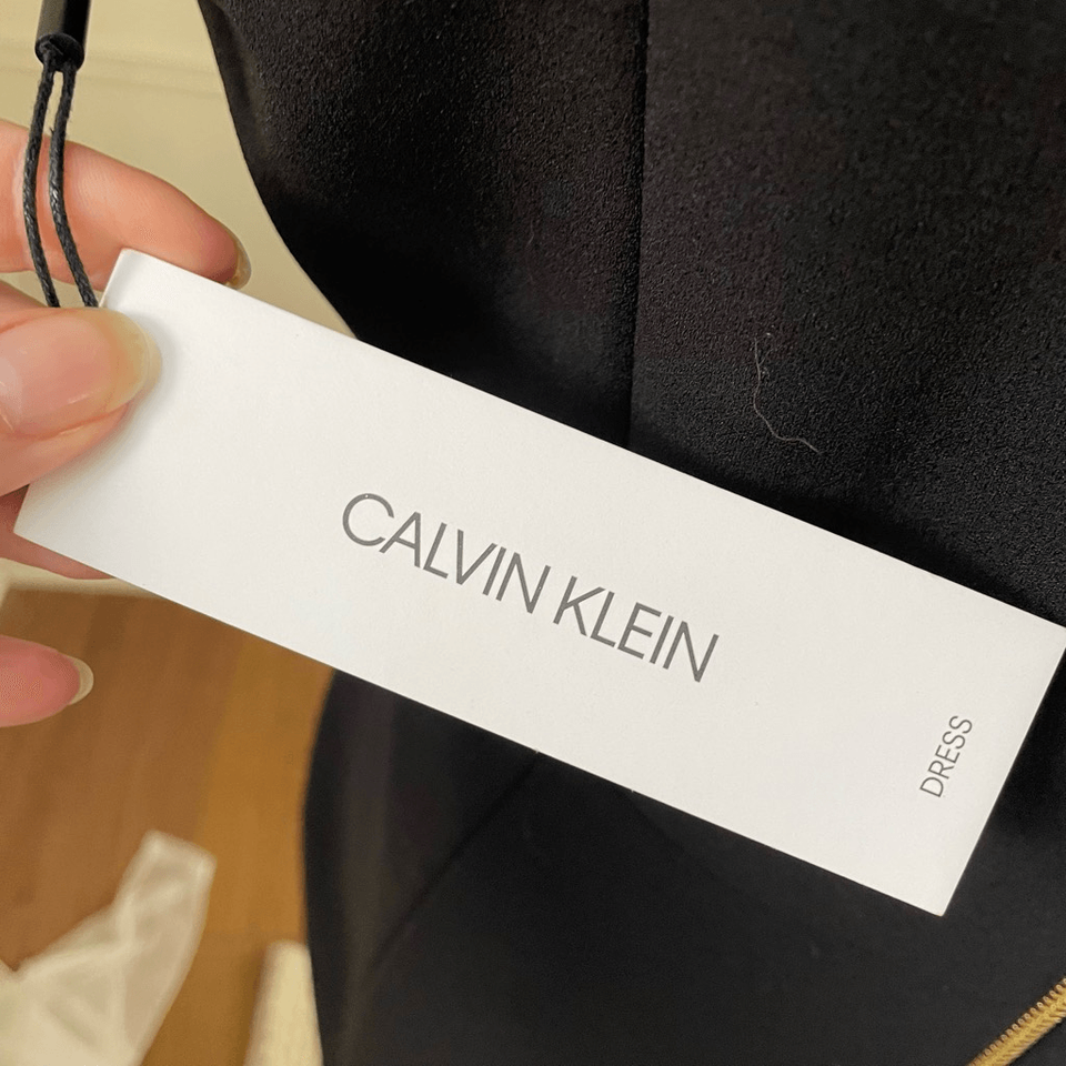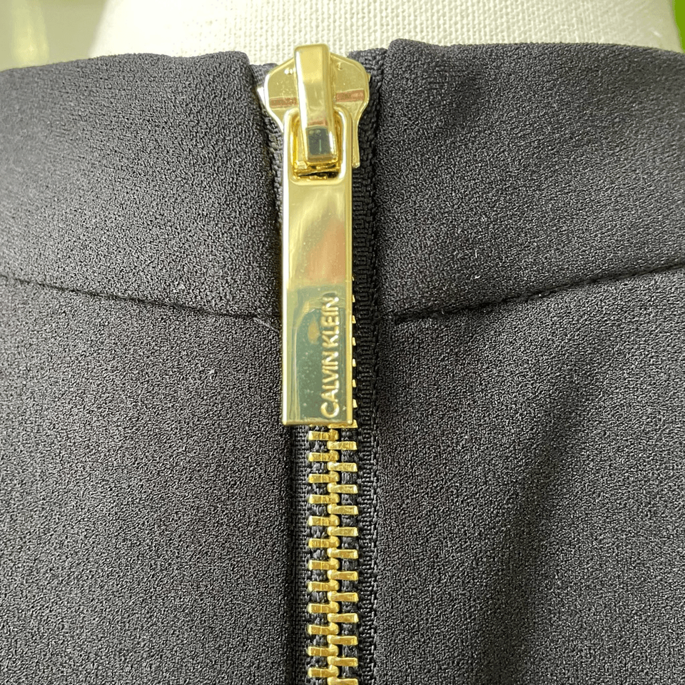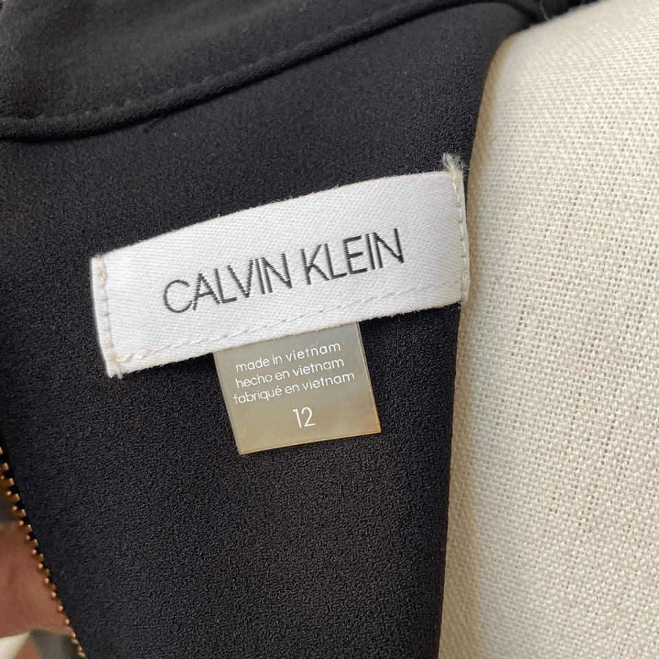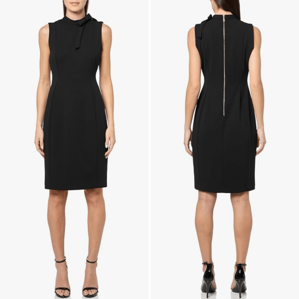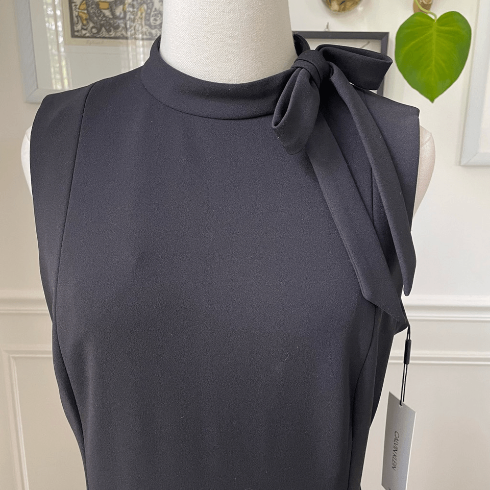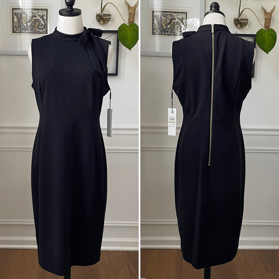New with tags, Calvin Klein scuba, crepe, polyester, spandex, blend little black dress with mock neck and shoulder bow. Exposed back gold zipper with logo zipper pull. Laying flat measure 40 inches shoulder to hem, 19 inches armpit to armpit and 16 inches straight across the waist. perfect for professional career funeral sheet dress LBD special occasion wedding