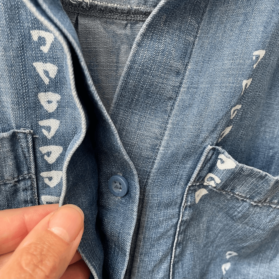 From Anthropologie cloth stone Lyocell chambray button up shirts with a slightly cropped fit and hidden button placket. The button does not go all the way up to the collar so it is a little V-neck cut. The blue chambray is decorated with batik style reverse bleach, tie-dye print. Raw hem. Laying flat measures 20 inches shoulder to him in the front with an additional 5.5 inches in the back and 20 inches armpit to armpit.