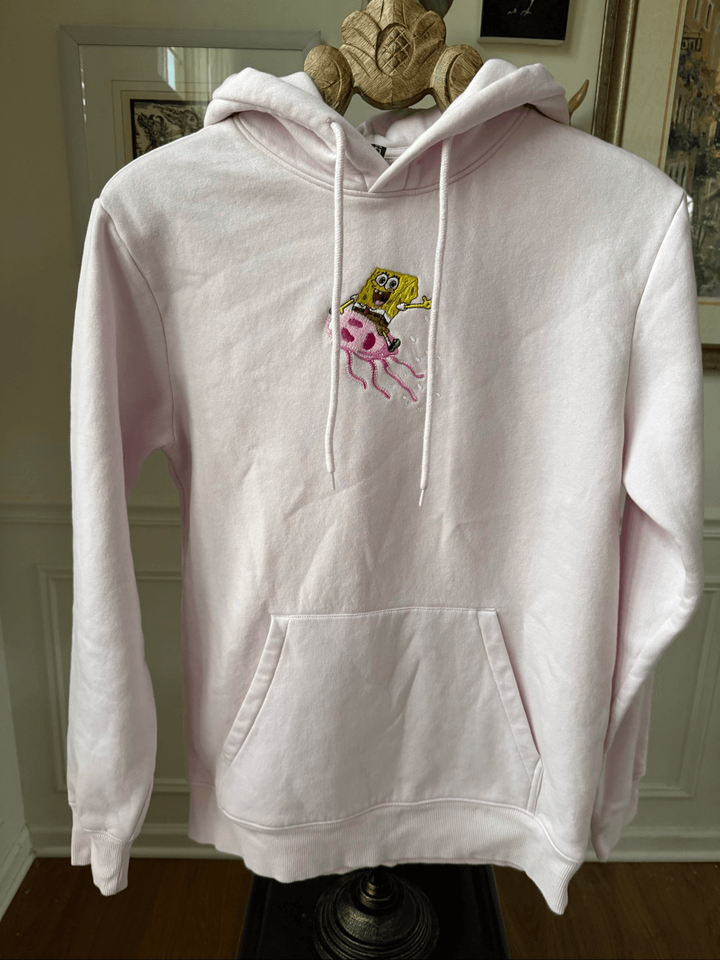 New without tags, Nickelodeon's SpongeBob Square Pants Divided H M Unisex Powder Pink Hoodie size small. Tags have been removed, but it?s never been worn in the inside is still soft and fleece. SpongeBob riding a jellyfish is embroidered with nice detail. Laying flat measures 27 inches shoulder to hem and 21 inches armpit to armpit.