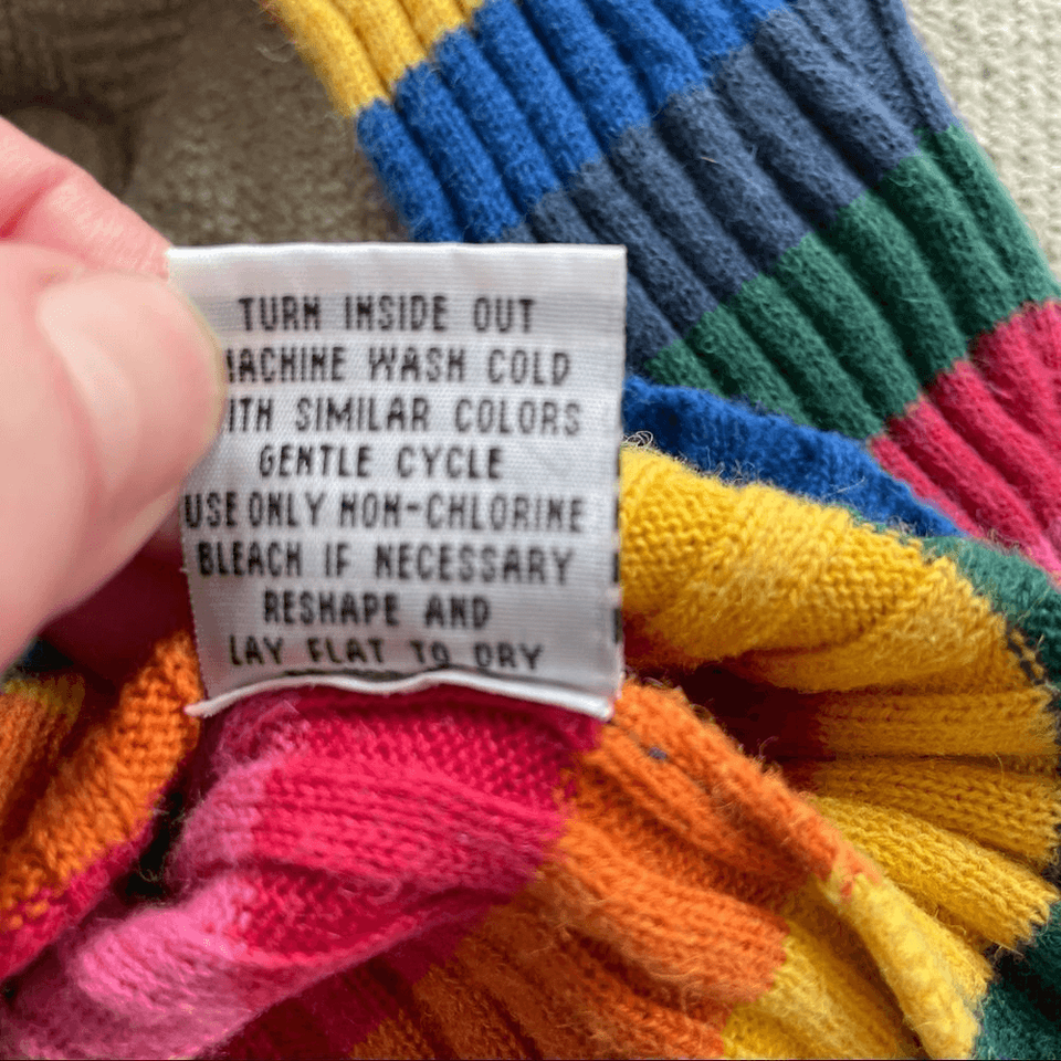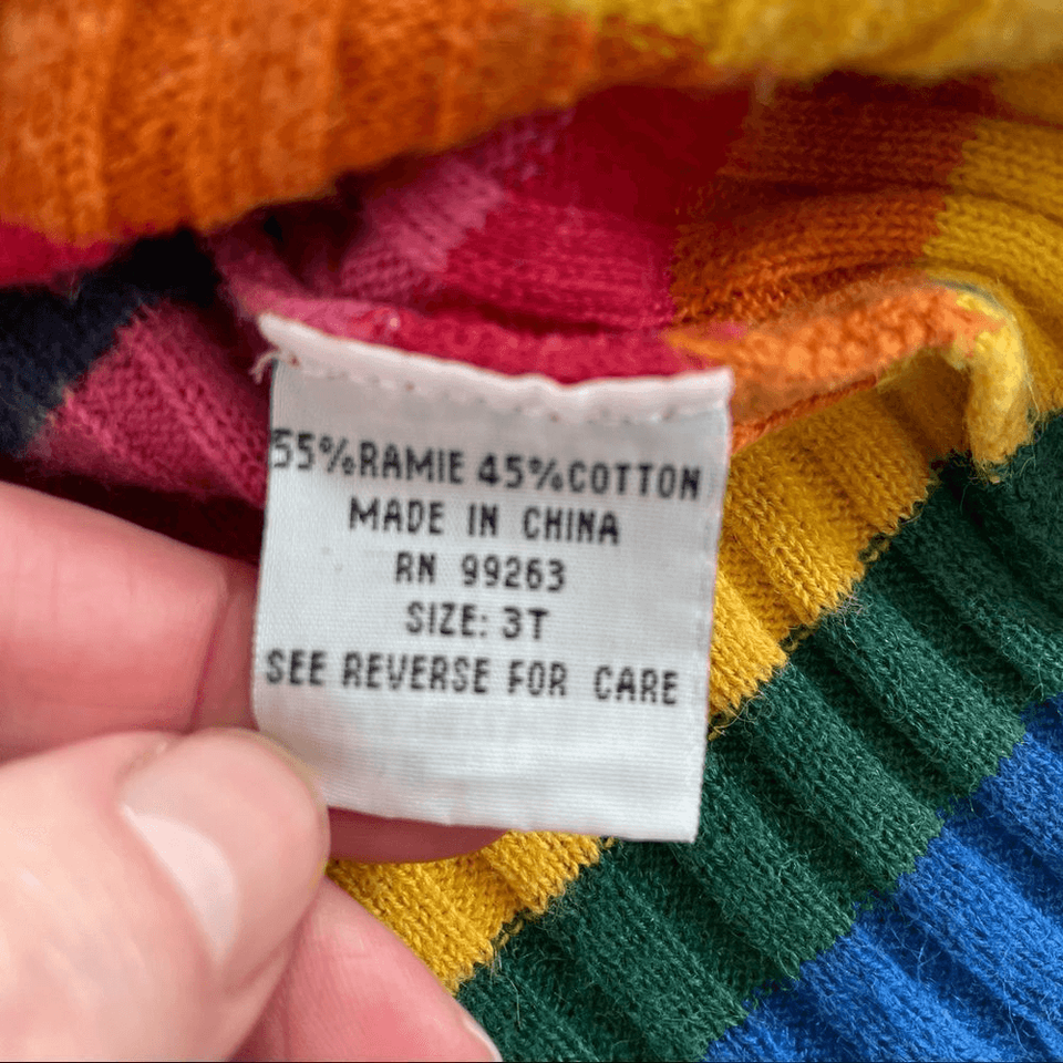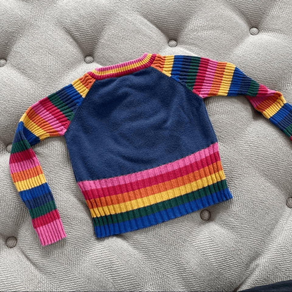 Nickelodeon 2003 SpongeBob SquarePants rainbow sweater featuring embroidered and applique SpongeBob and rainbow on the front. There is some mild fading due to wash wear but this thing is so awesome that you won?t even notice. The size 3T End it measures 13 inches from shoulder to hem and 12 inches from armpit to armpit. Soft ramie cotton blend