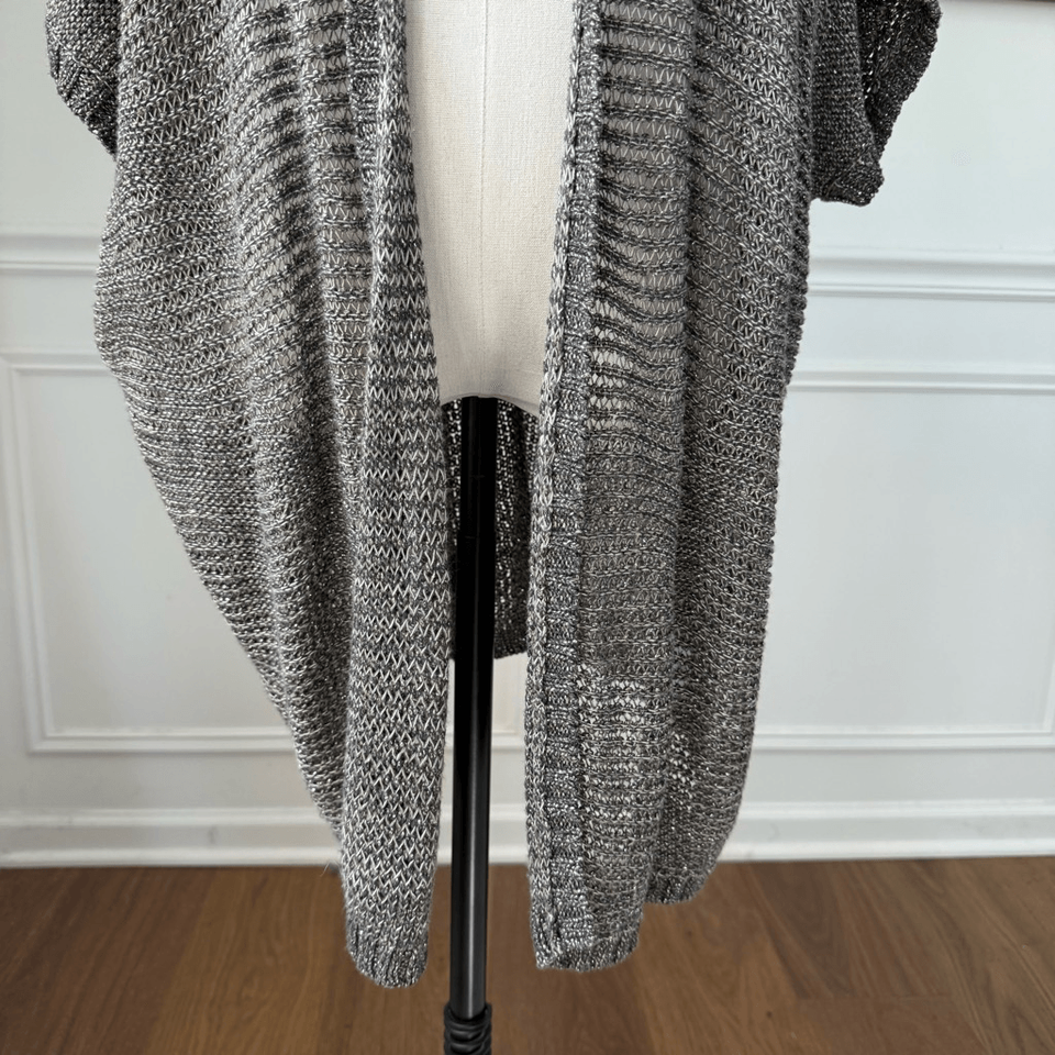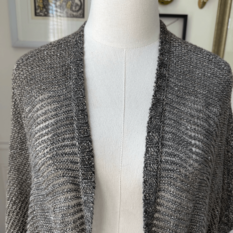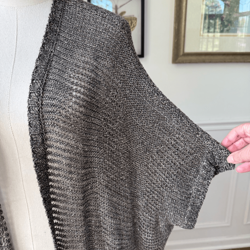 Light and airy Eileen Fisher variegated link taupe color cardigan with subtle silver metallic shimmer. The taupe is created by mixing gray and tan threads, but the manufacturer causes the color bronze. Retailed for $278. ?