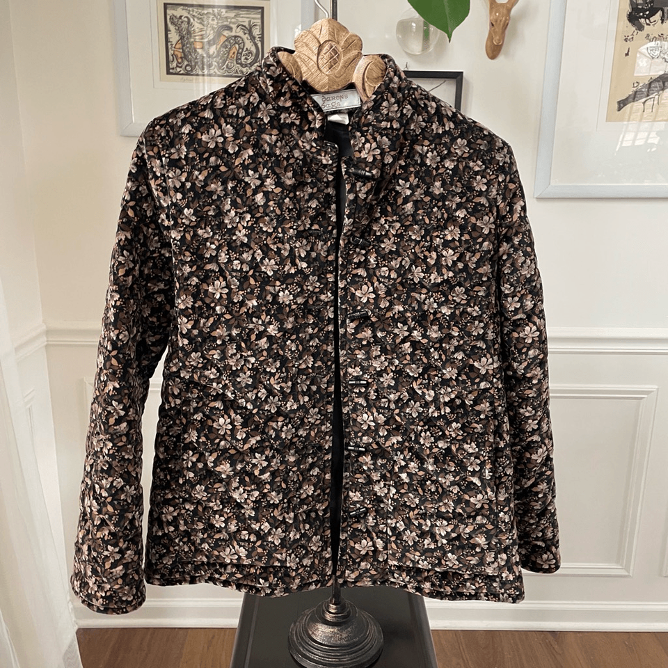 70s Daren?s Bags artisan made quilted band collar jacket in shades of brown floral velveteen with black lacquered buttons. Nehru style collar. Hip pockets. Tag size small and machine washable. Laying flat measures 26 inches shoulder to hem and 20 inches armpit to armpit. Daren is a local (to me) artisan who?s featured predominantly at the famed Ann Arbor art fair every year starting in the 70s. This was my mother?s jacket that she purchased there and as much as I love it it just doesn?t flatter me, so I mostly just look at it. Lol. Someone should wear this gem. the style is very reminiscent of Gunne Sax, imo, and very on trend today.