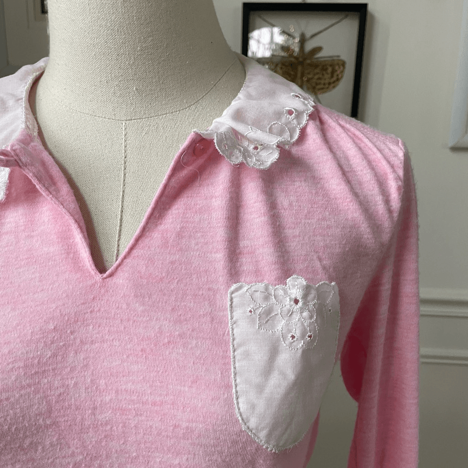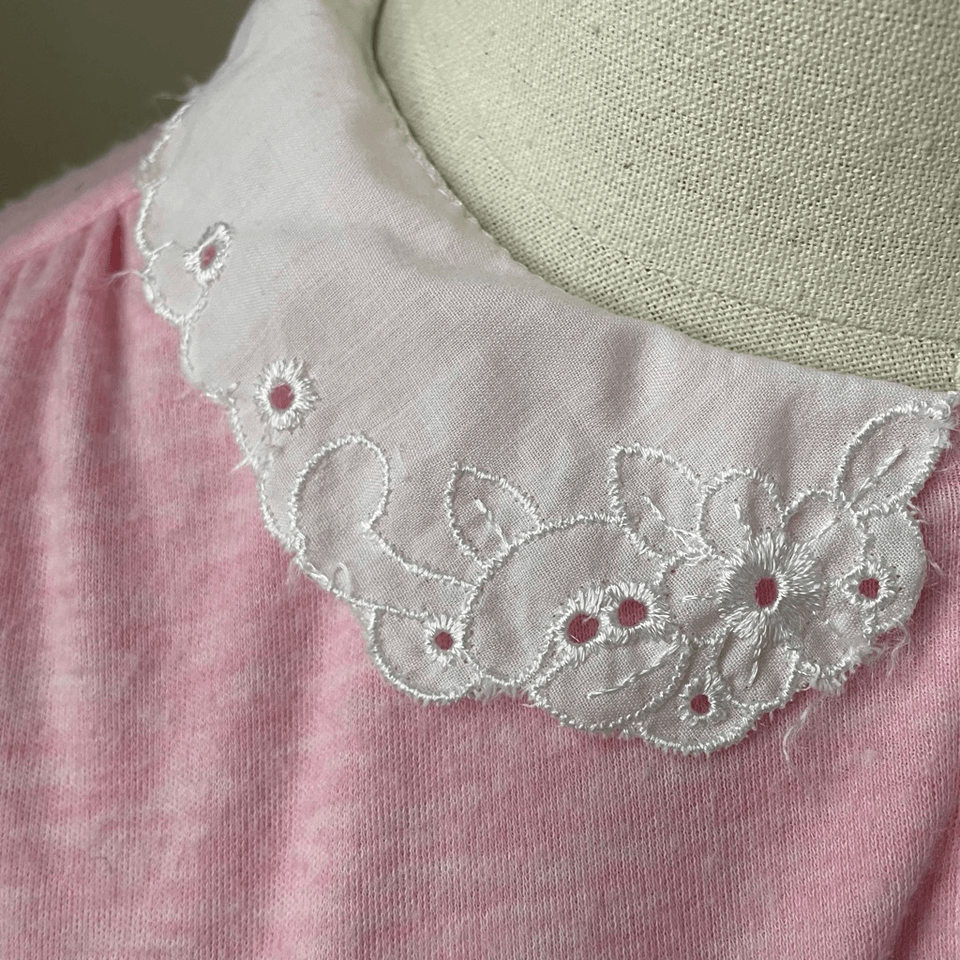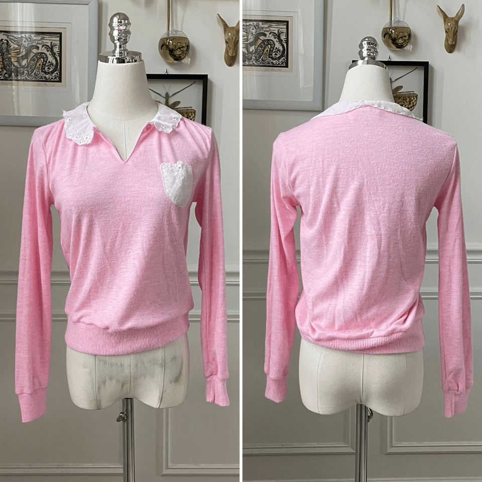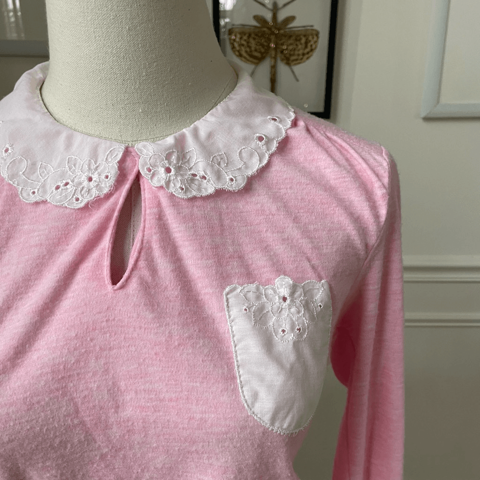 Vintage 70s Pink Top White Eyelet Lace Peter Pan Collar XS