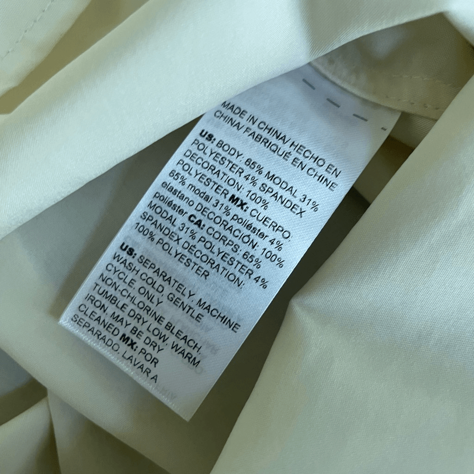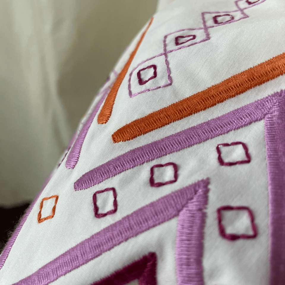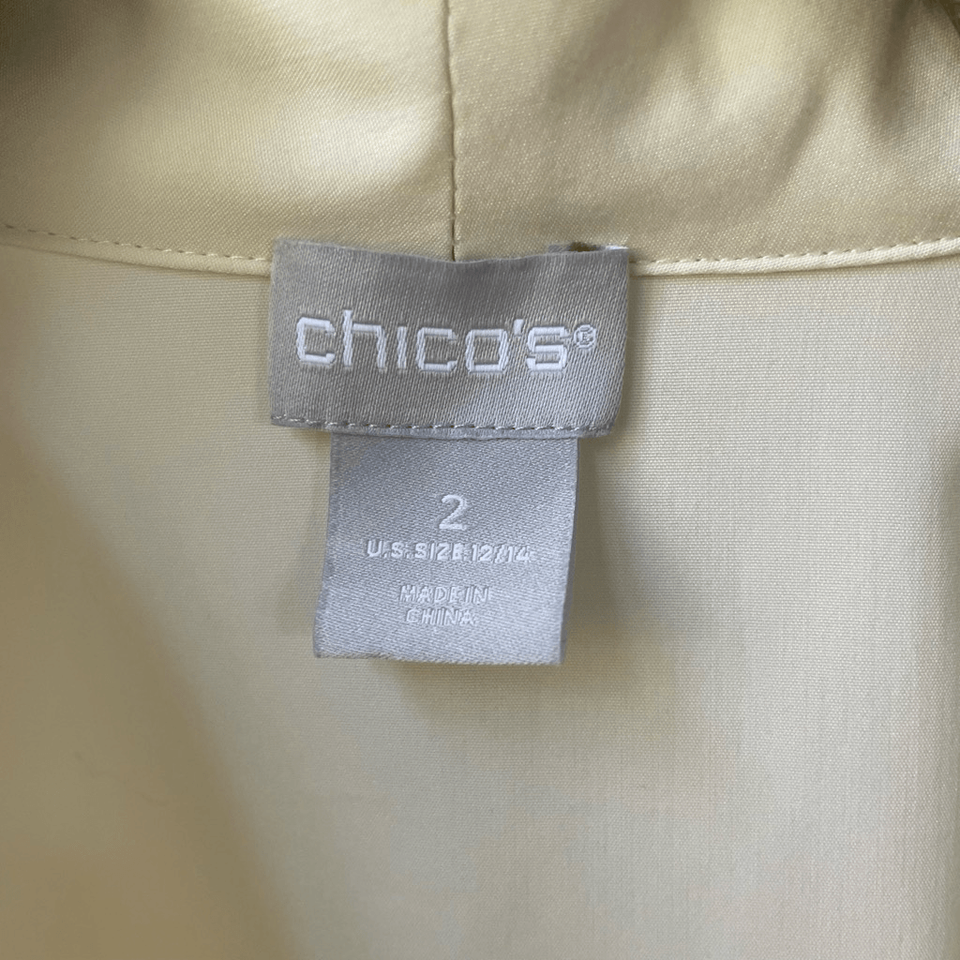 Chicos ivory color, V-neck, balloon sleeve blouse with orange, plum, and lavender embroidery from elbow to cuff. Chico size 2, which is roughly equivalent to a US size medium, or 12 according to their size chart. If you are unfamiliar with their sizing, please note these measurements: Laying flat measures 27 inches shoulder to hem and 23 inches armpit to armpit. Not hip for easy movement and modal polyester and spandex blend.
