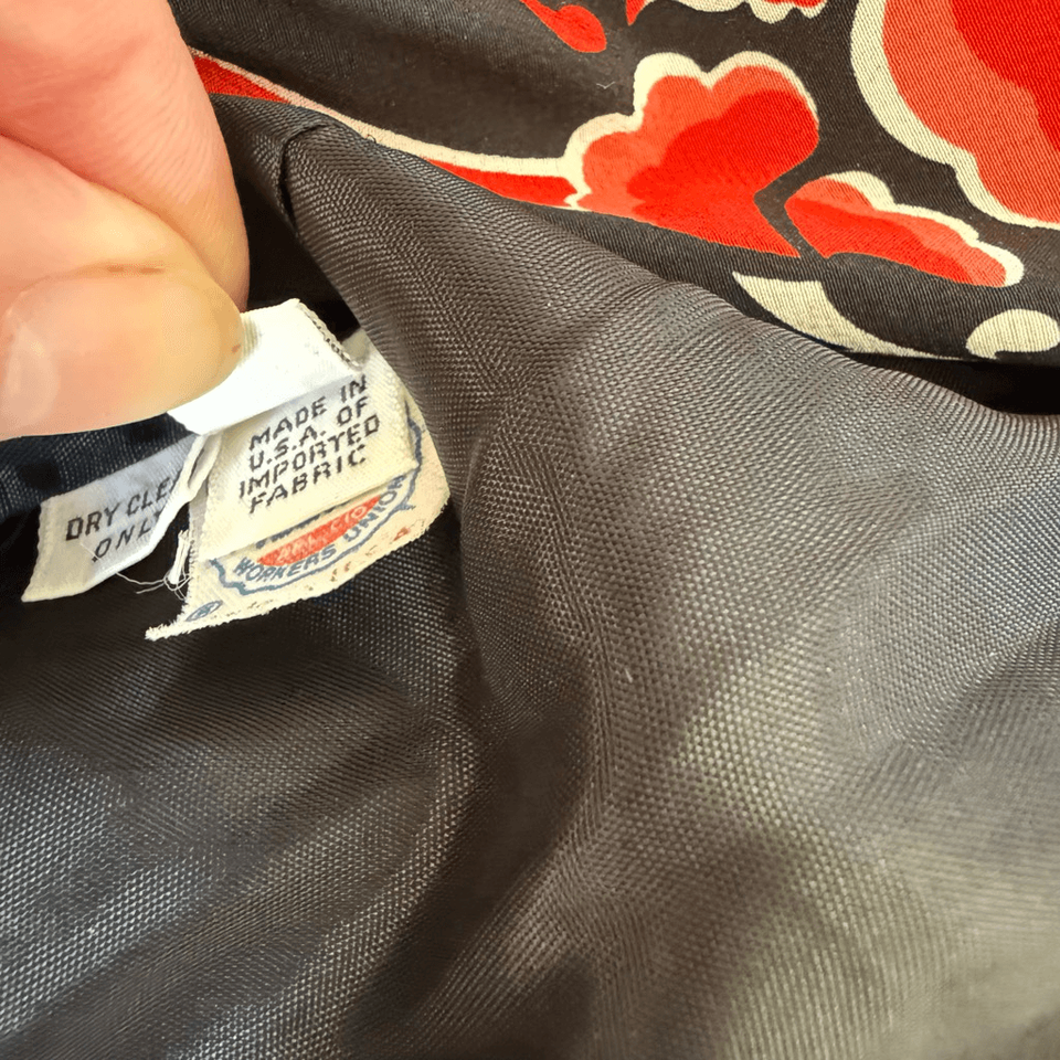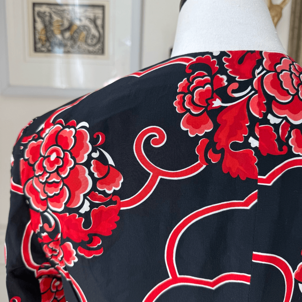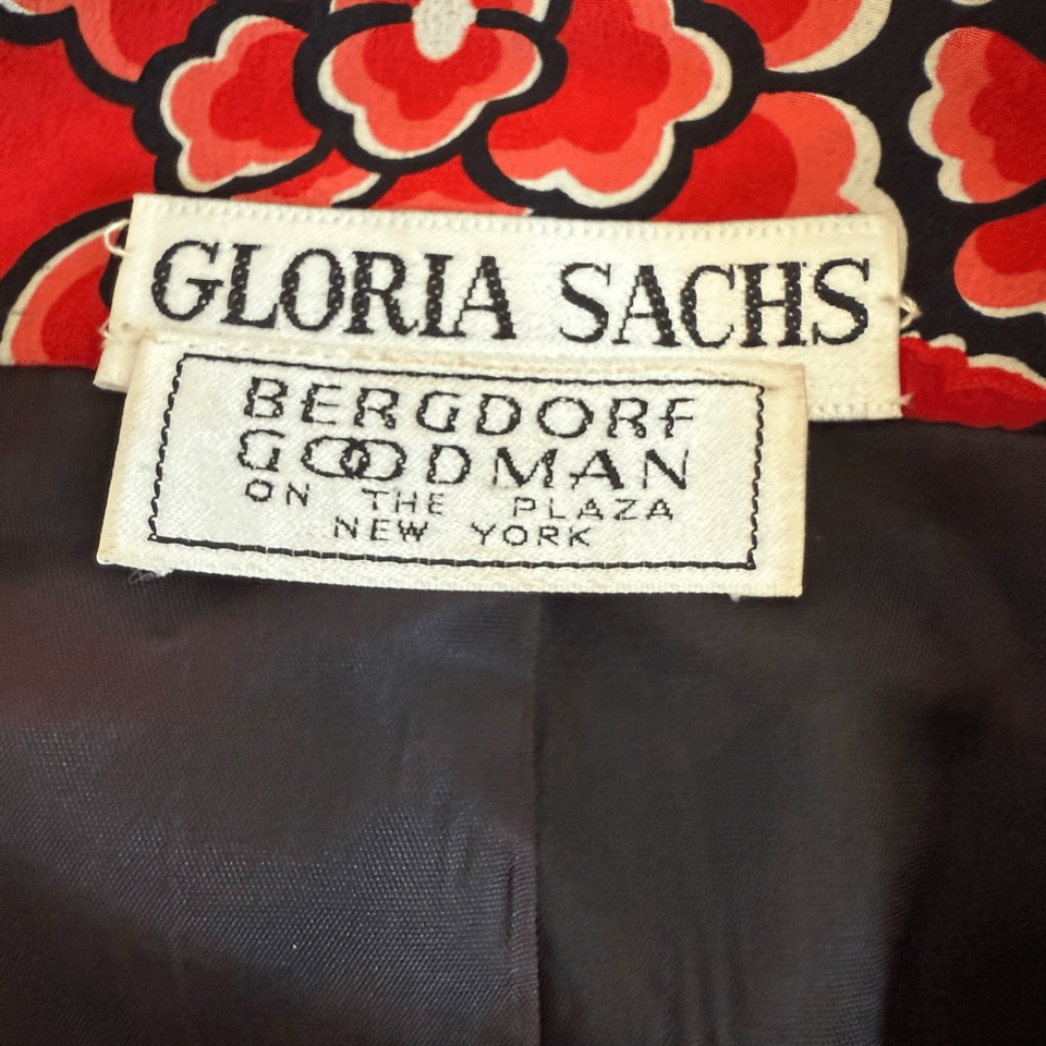 80s Gloria Sachs from Bergdorf Goodman on the plaza New York double breasted jacket in black with bold red floral and scroll print. Try color, union tag and lightly padded shoulders. Collarless with lapel and single row of double breasted buttons. Lined. Tag size 8. There is no fabric content tag, but I would all but guarantee this is silk. Laying flat measures approximately 25 inches shoulder to hem and 20 inches armpit to armpit.