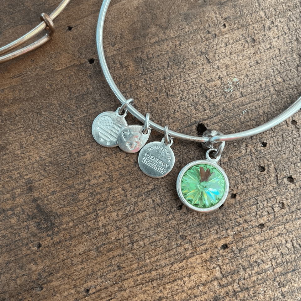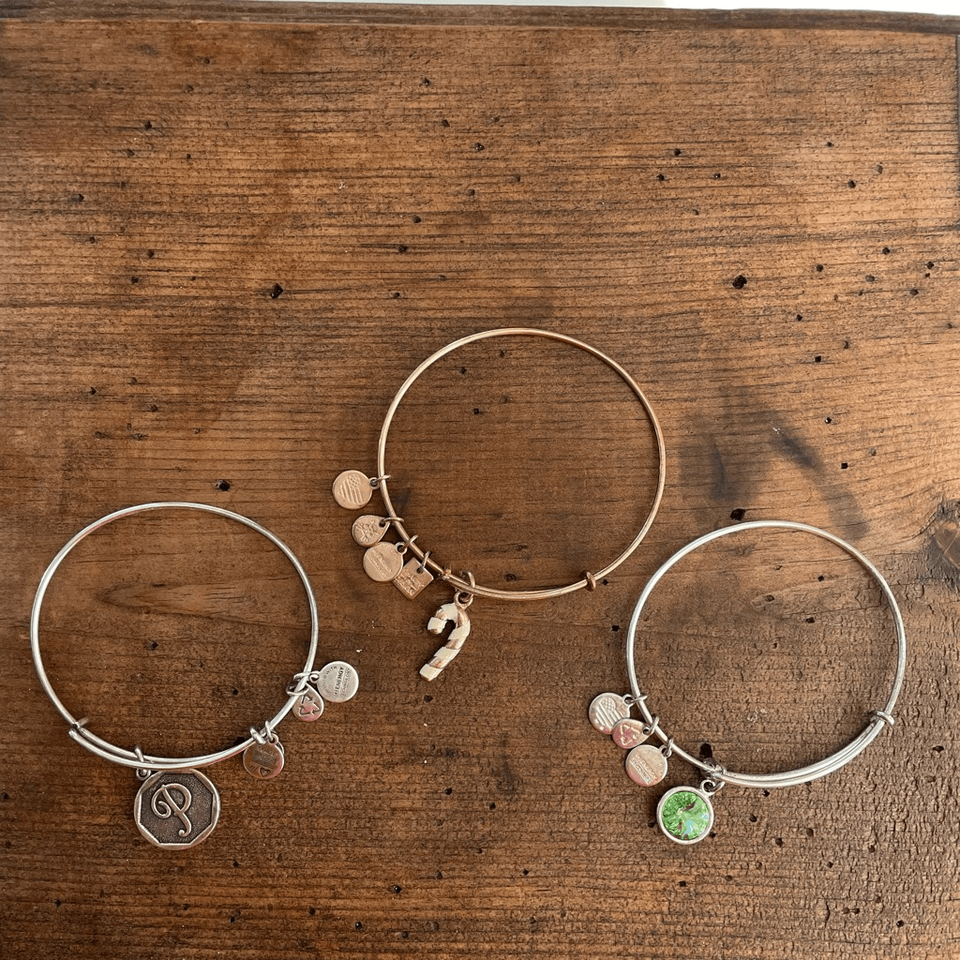 3 Alex and Ani Charm Bangle Bracelets. Alex and Ani. One is Rose Gold Candy Cane Charm Bangle Bracelet, the second is a silver initial of the letter P, and the third is silver with August peridot charm.