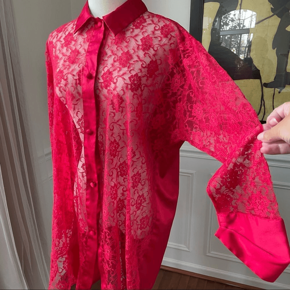 Vintage gold label Victoria?s Secret red night shirt that is sheer lace in the front and solid red satin in the back. Satin covered buttons, collar and cuffs. Laying flat measures approximately 23 inches armpit to armpit and 32.5 inches from shoulder to hem. Lydia Dietz, Beetlejuice.