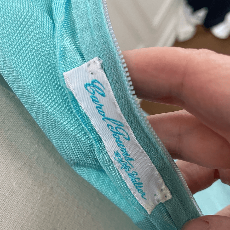 Vintage 60s 70s Carol Gowns by Mr Walter 2 pc turquoise halter gown with long sleeve cropped jacket topper. The long halter dress has a large white collar with ruffle trim that fastens at the back of the neck before opening to an open back and zipper closure. The jacket topper is long sleeve with white ruffle cuff and very cropped. The tag in the jacket says this is a size 10 but definitely not by modern standards. It is featured on my size small dress form where it is snug through the torso right below the bust, so I am listing this as a modern XS. Please double check these measurements to ensure the proper fit for you. Laying flat the jacket measures approximately 13 inches long and 16 inches armpit to armpit. it snaps shut in the front. The dress measures approximately 55 inches long, 16 inches armpit two armpit with darting to accommodate cup size and some flexibility with the open back, 15 inches straight across the waist (it is Empire waist and measures 12.5 inches right underneath the bust line ) and 17 inches straight across the hip. Perfect for prom, bridesmaids, or any formal occasion with a funky retro mod garden party vibe. No noted flaws. Palm Royale