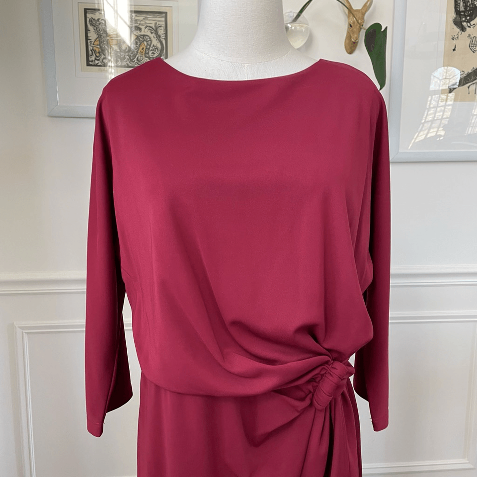 H by Halston three-quarter length sleeve, blouson top and faux wrap skirt dress. 100% stretchy, weighted polyester. Decorative knot and gather at the hip. No tags but I don?t think I ever wore this. Laying flat measures approximately? 39 inches shoulder to hem, 21 inches armpit to armpit and 17 inches straight across the waist