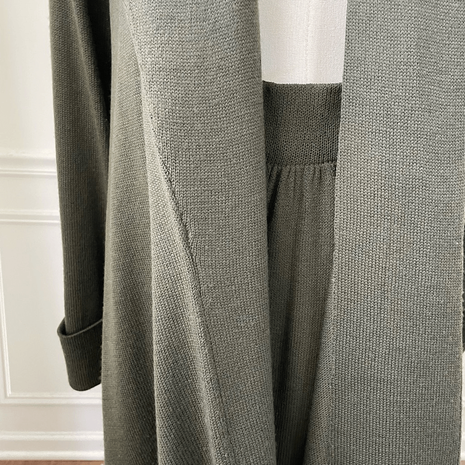 St John dark olive green 2pc Santana knit skirt and open front jacket or cardigan set. The skirt is pull on pencil style with front pleats and hip pockets. Tag size 8. Laying flat measures just shy of 14 inches straight across the waist and 26 inches long. The jacket or cardigan is open front and a unique St. John piece- one I don?t see very often. It is generous in sizing and longer in length with a shawl collar. No pockets. Padded shoulders. Laying flat measures 35 inches shoulder to hem and the bust measurement is pretty free but if I line the open seams it?s approximately 21 inches armpit to armpit. The jacket size is small. no holes or snags.