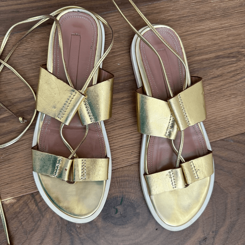 BCBGMAXAZRIA Vitalia Gold Leather Gladiator Sandal, $138 retail. White rubber, man-made sole. Gently preowned. See pictures. Stamped size 36.5 on the bottom which roughly translates to a US 6.5.