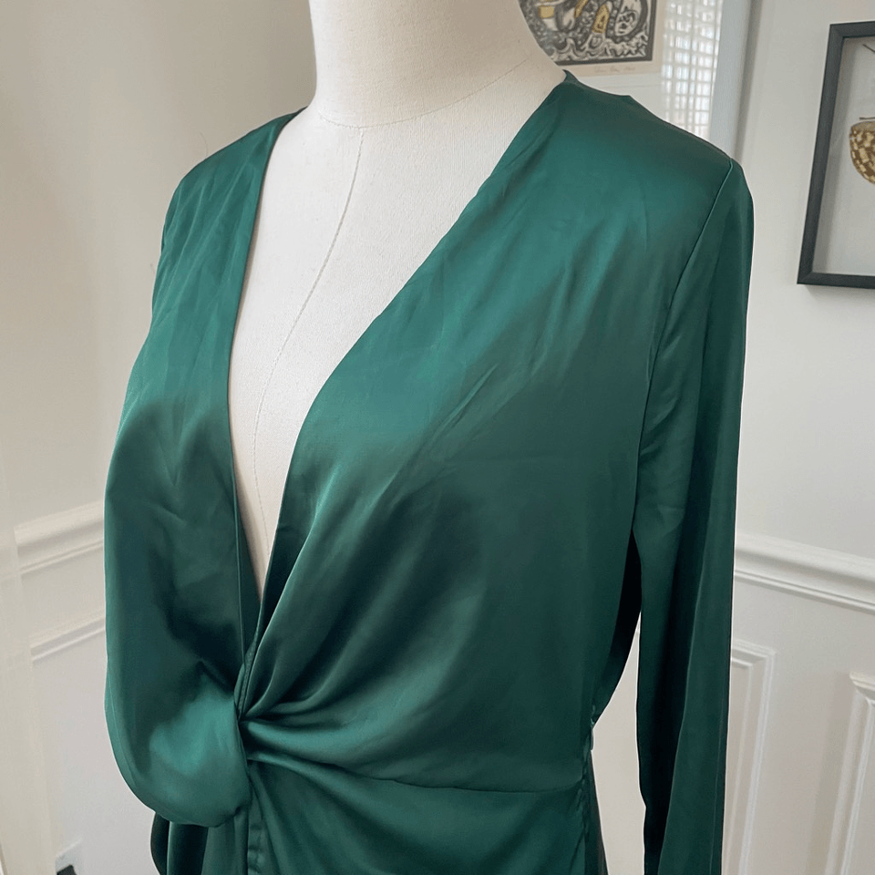 Fashion Nova Sugar Free mini Dress in Hunter Green satin. Knot your average mini dress. Show off what you're working with in our Sugar Free Dress. This best-selling (and Kylie Jenner - Approved) satin mini features a deep V neckline, front slit and knot detail. Choose from a variety of colors, but be prepared to own them all.