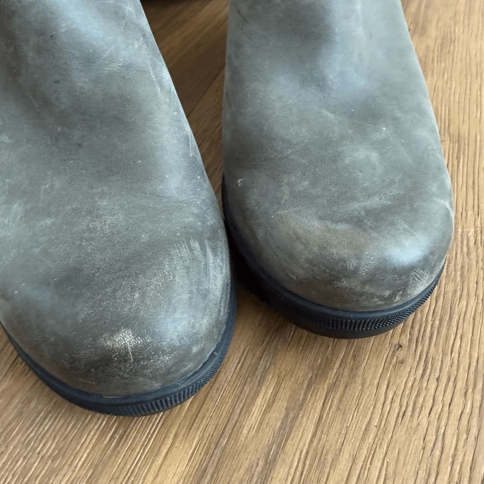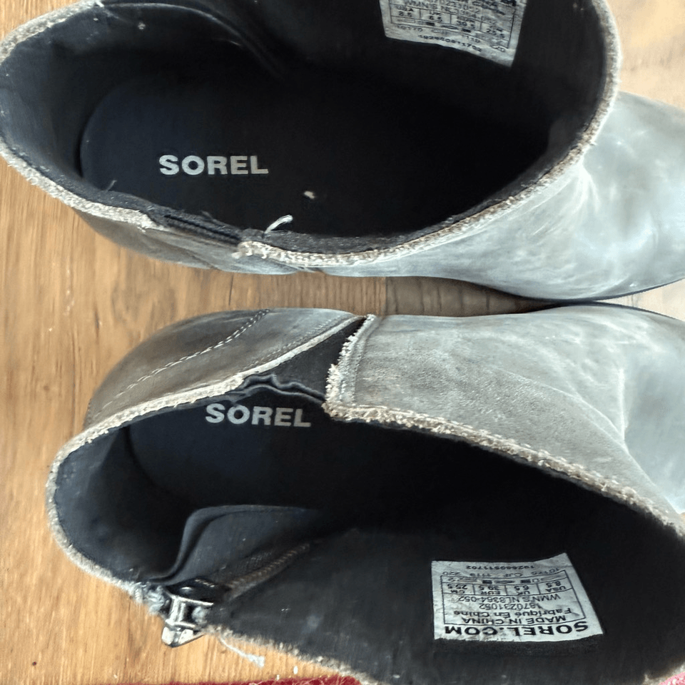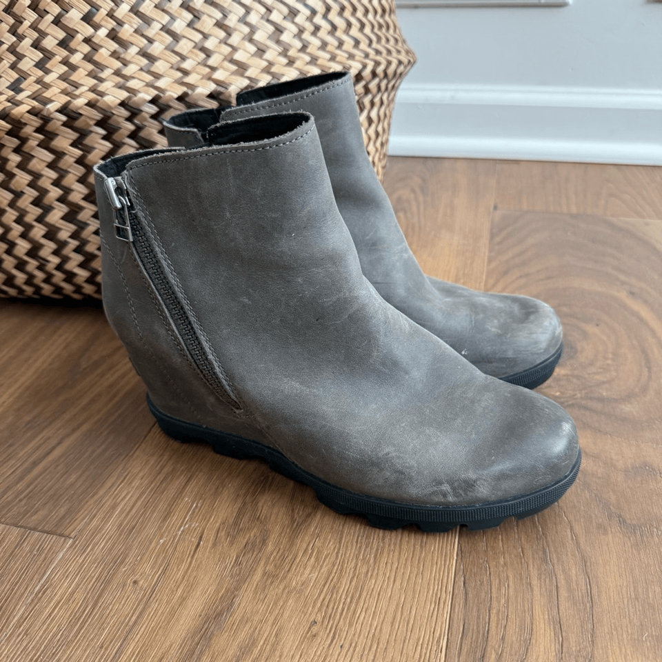 Sorel Women's Joan of Arctic Wedge II Zip boots. The color is called quarry which is a grayish olive green color. Most people just call them gray, but I really feel there?s a green undertone. These ankle boots feature a full-grain leather or suede upper, a zip closure for easy wear, and a wedge heel. The outsole is made of molded rubber, providing traction and durability. The boots are waterproof, making them suitable for various weather conditions. The style number for this model is NL3364-052