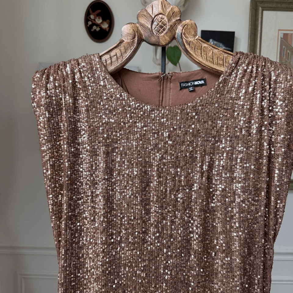 Fashion Nova Sparkle And Snatched Shoulder Pad Jumpsuit. They called this chocolate, but I think it has a definitive copper cast to it. Stretch Sequin Jumpsuit