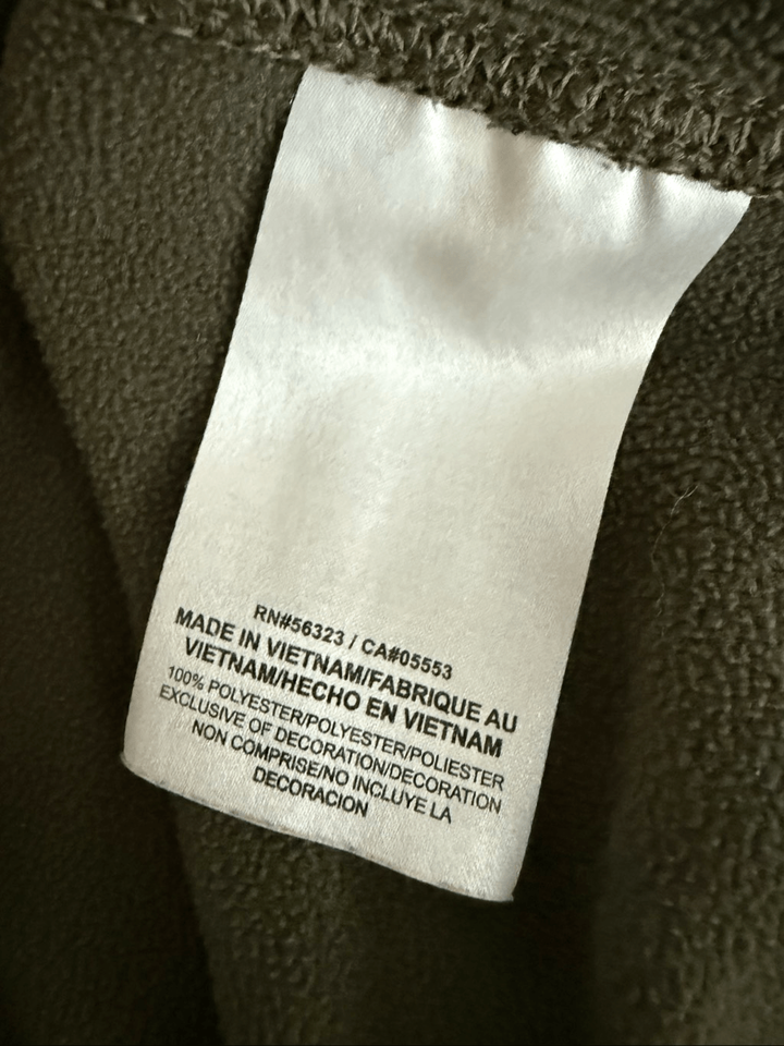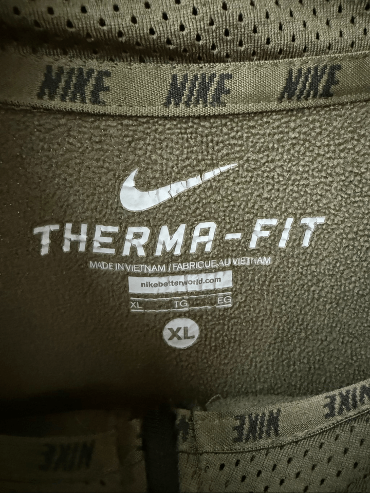 Nike Therma-FIT 1/4 Zip Pullover in khaki green, which is an olive green color. Style number 715199?325. 100% polyester with black embroidered Nike swoosh and black contrast on the under arm. Tax size XL. Laying flat measures 28 inches shoulder to have and 24 inches armpit to armpit.