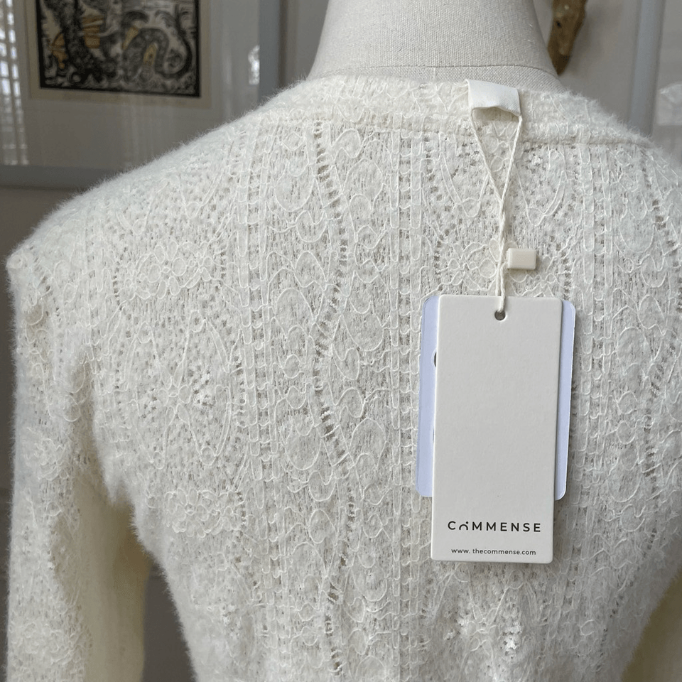 New with tags, Commense Floral Hollow Knit Crew Neck Long Sleeve Top. Ivory. Composition: 90% Polyester, 10% Elastane
