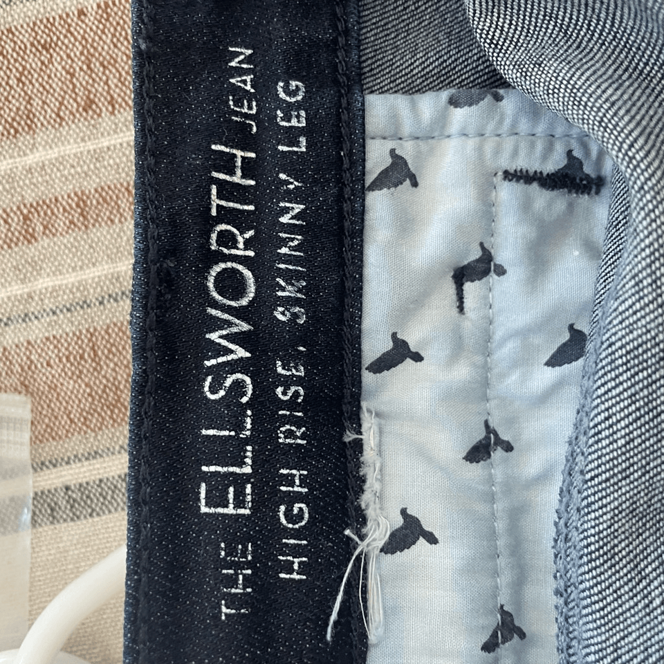 MIh Jeans dark blue wash Ellsworth high-rise skinny jeans. Interesting hip pocket detail and embroidered branding at the back pockets. Laying flat measures 17 inches straight across the waist with 9.5 inch rice and 30 inch inseam. For the record, the brand says these are high-rise, but I don?t find them to be particularly high-rise in my opinion.still a fantastic pair of jeans. I love this brand.
