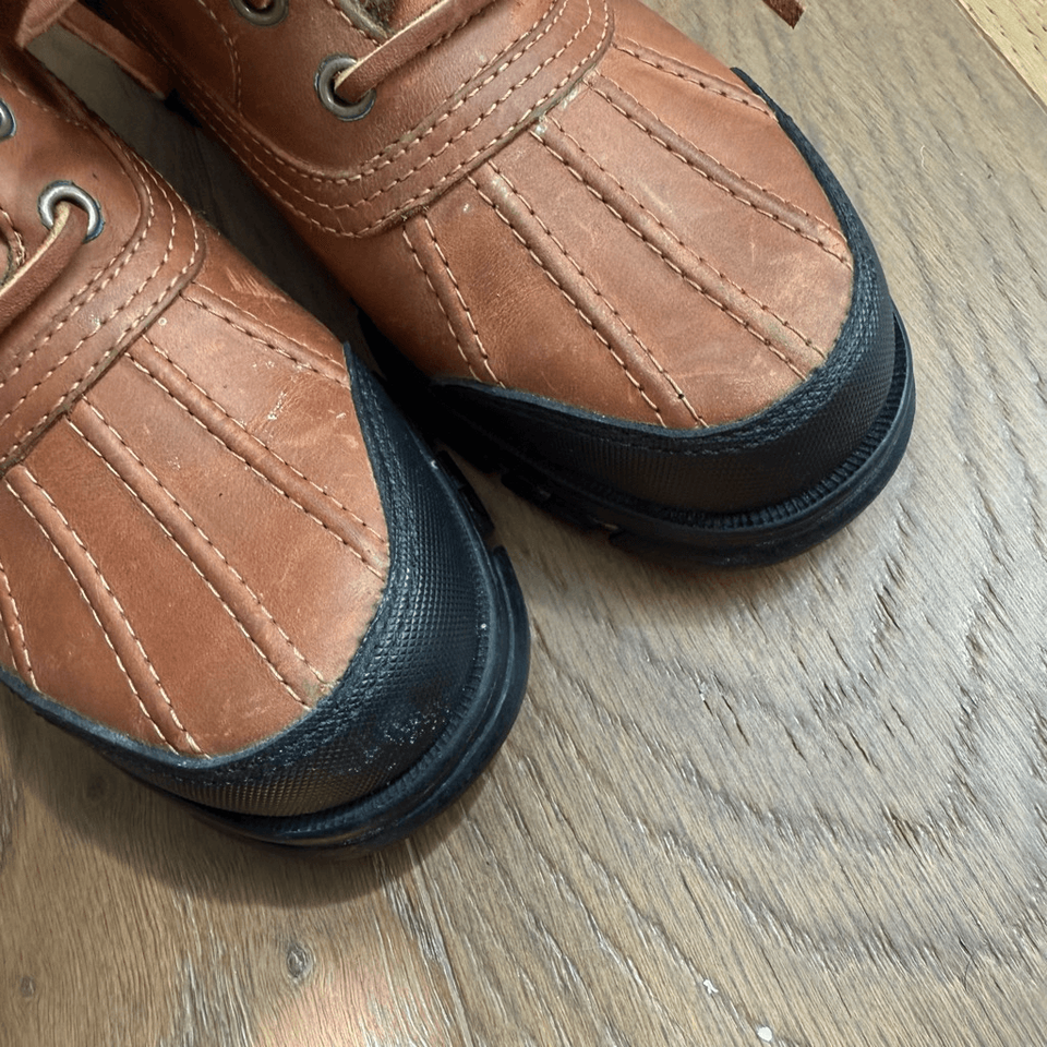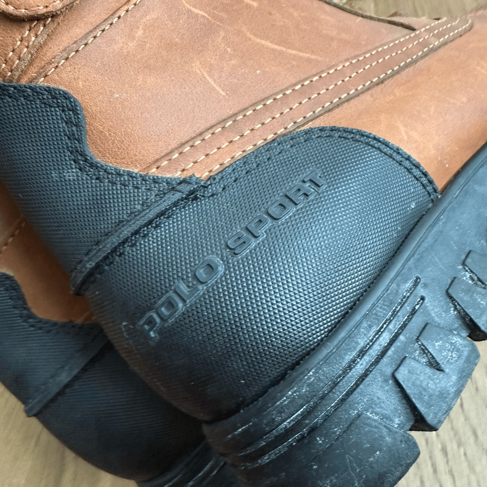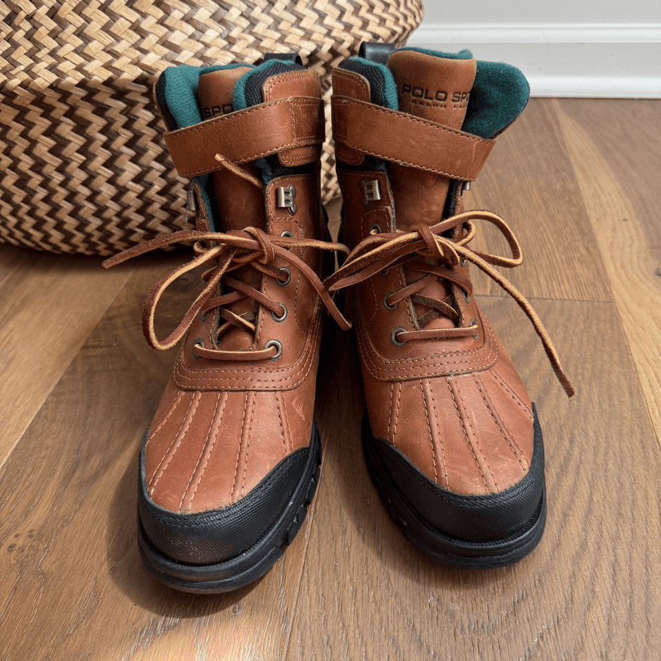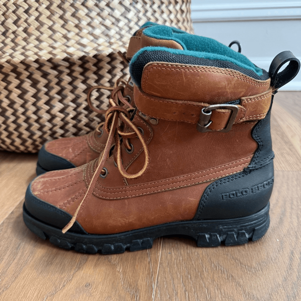 Women?s Ralph Lauren Polo Sport Brown Leather insulated duck boots with rubber lug sole. Rawhide lace up with buckle strap. No wear to the tread. Water resistent. Size 8