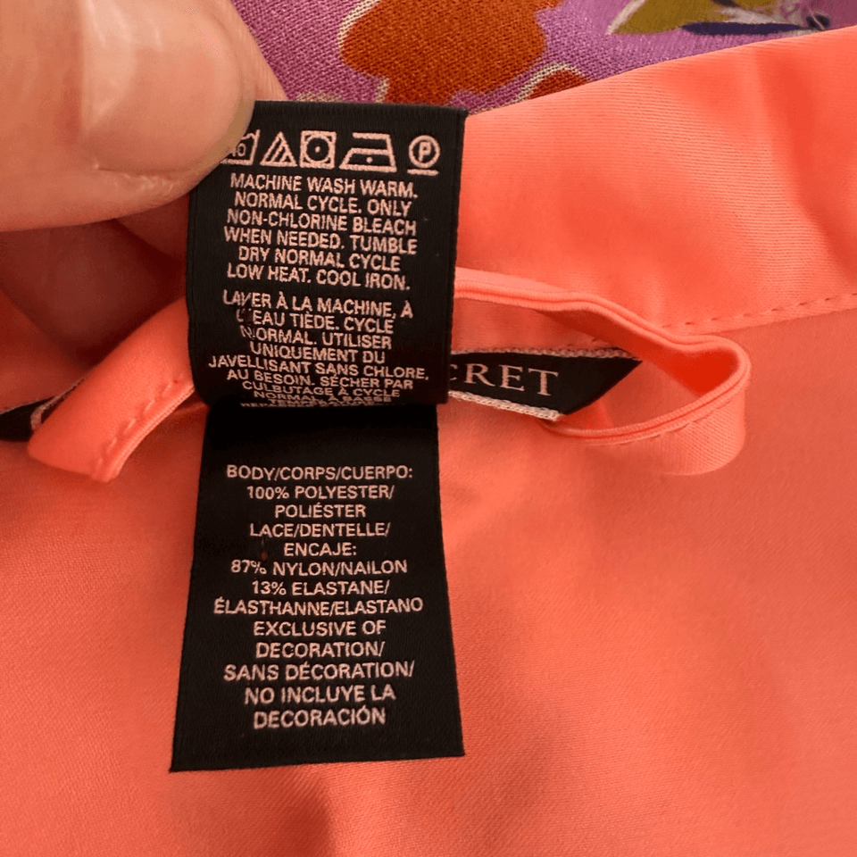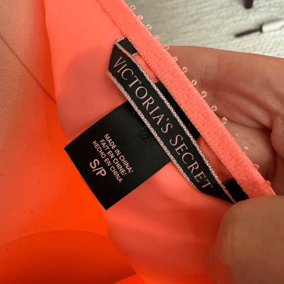 Victoria?s Secret two piece chemise and short cap sleeve robe in electric coral satin with lace trim, and inset panels at the shoulder. Tag size small. Laying flat measures 13 inches armpit to armpit and 28 inches shoulder to him with adjustable straps. The robe measures 33 inches shoulder to him and has a removable sash. The bust measurement on the robe is flexible.