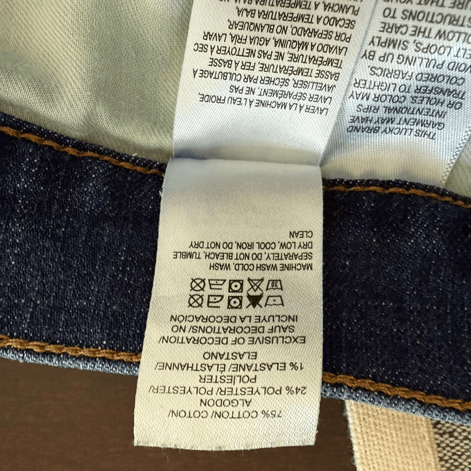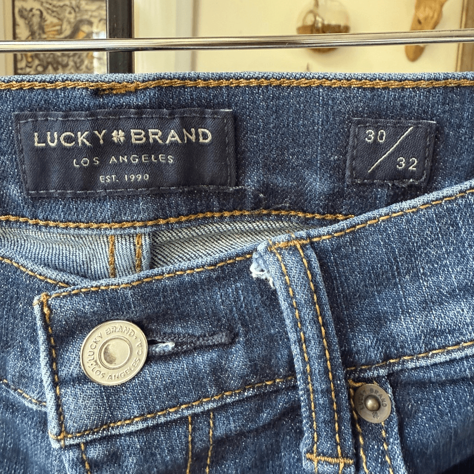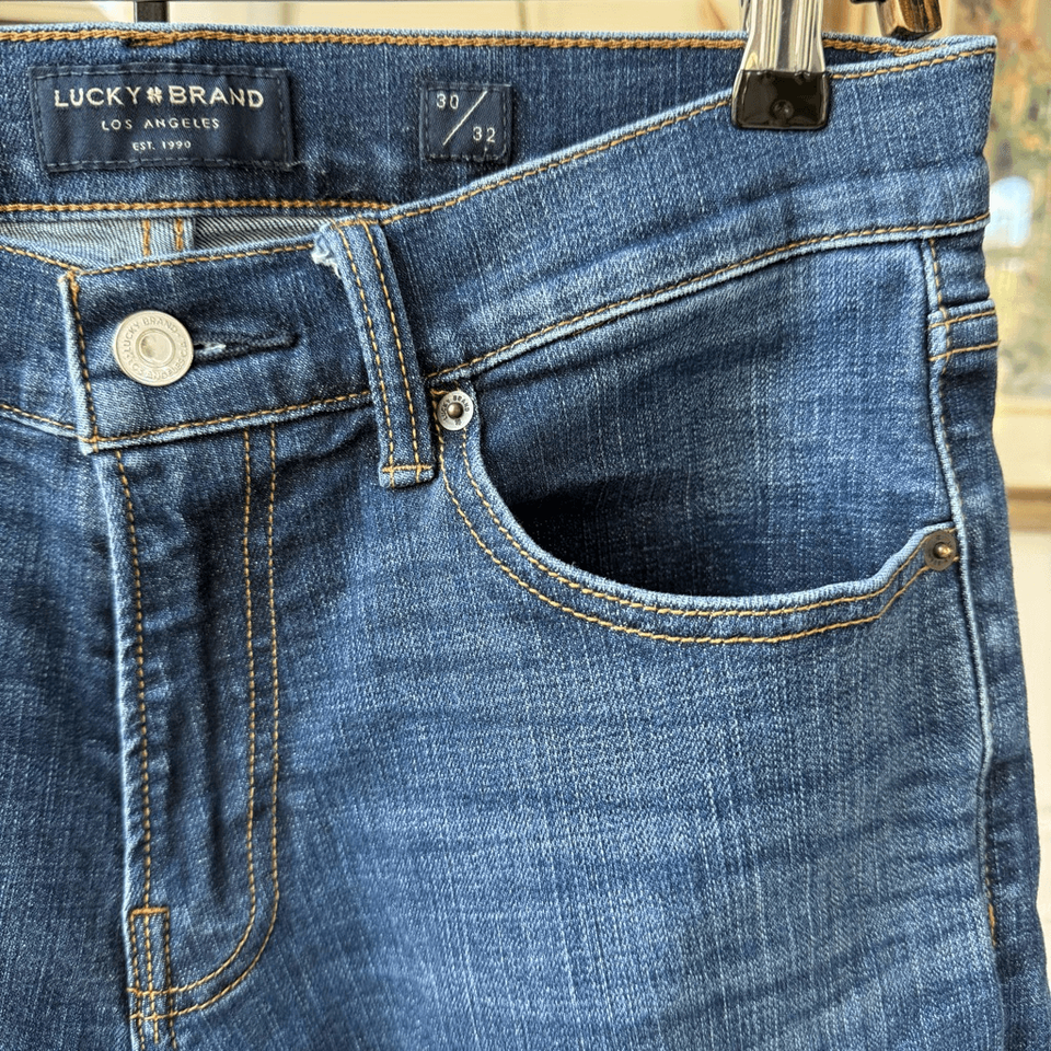 Men?s Lucky brand cotton, polyester spandex blend 212 straight leg jeans with button and zip fly closure. Tag size 30 x 32, however these have been washed and line dried and the inseam is now 31 inches which is our experience with this brand. No noted flaws.?