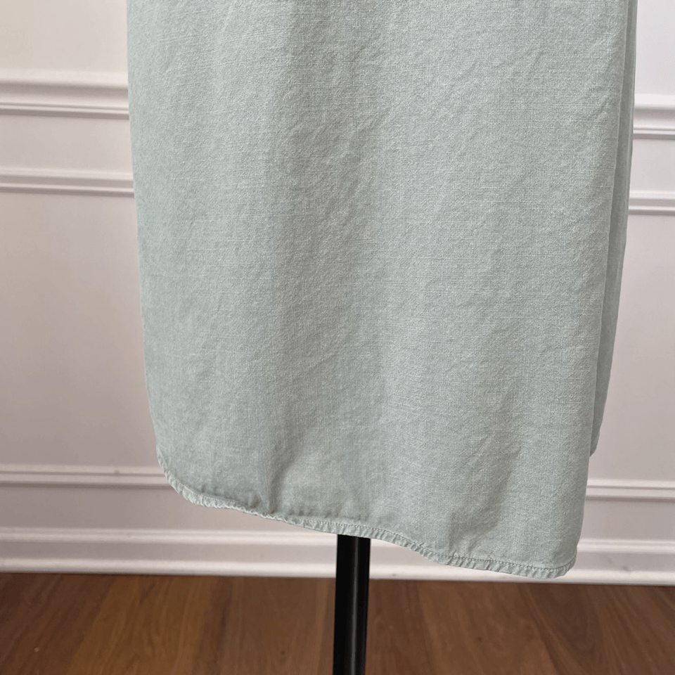 From Anthropologie, Cloth and Stone Liv moss green tie waist mini dress with V-neck, short sleeves and elastic across the back waist for a feminine fit. Tie in the front or in the back. I prefer it tied in the back to hide the elastic, but it can be worn both ways. The color is called moss green green, but it is a soft sage, green color. 100% tencil but the fabric content tag has been removed. $138 retail. Laying flat measures 34.5 inches shoulder to hem, 20 inches armpit to armpit and 17 inches straight across the waist untied.