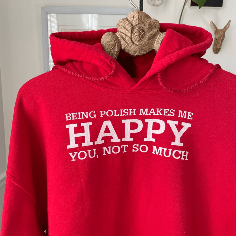 Gildan Polish pride humor pull over hoodie sweatshirt in cotton and polyester blend. Red with white print on the front that says, ?being polish makes me happy you, not so much?. Kangaroo pocket. Laying flat measures 27 inches shoulder to hem and 26 inches armpit to armpit ?