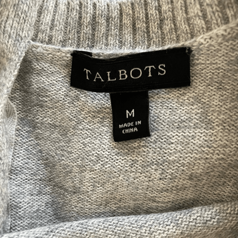Talbots women?s light gray tunic length sweater with notch hip for easy movement, small wet pockets in the front and an exposed silver tone zipper at the back neck. Cotton and rayon blend. Laying flat measures 26 inches shoulder to hem and 18 inches armpit to armpit. Tag size medium. The knit has stretch.