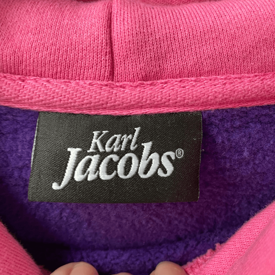 2021 Limited Karl Jacobs Originals Enchantment Hoodie in multicolor, color block, shades of purple, aqua, light, blue, pink, and yellow. 100% cotton with branding at the edge of the kangaroo pocket, in Boucle on the front, and on the metal drawstring pulls. Laying flat measures 27 inches shoulder two hem and 23 inches armpit to armpit. No stains, holes or noted flaws.