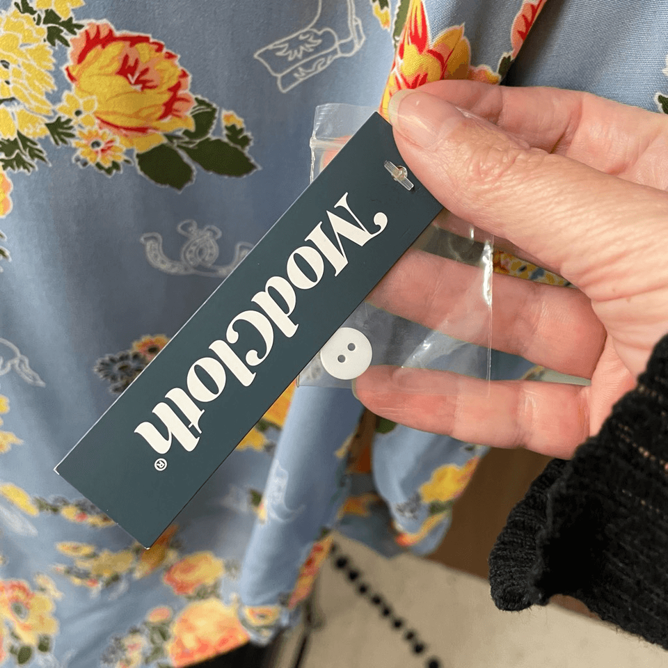 New with tags, women?s ModCloth blue floral blouse in yellow and red cabbage rose,