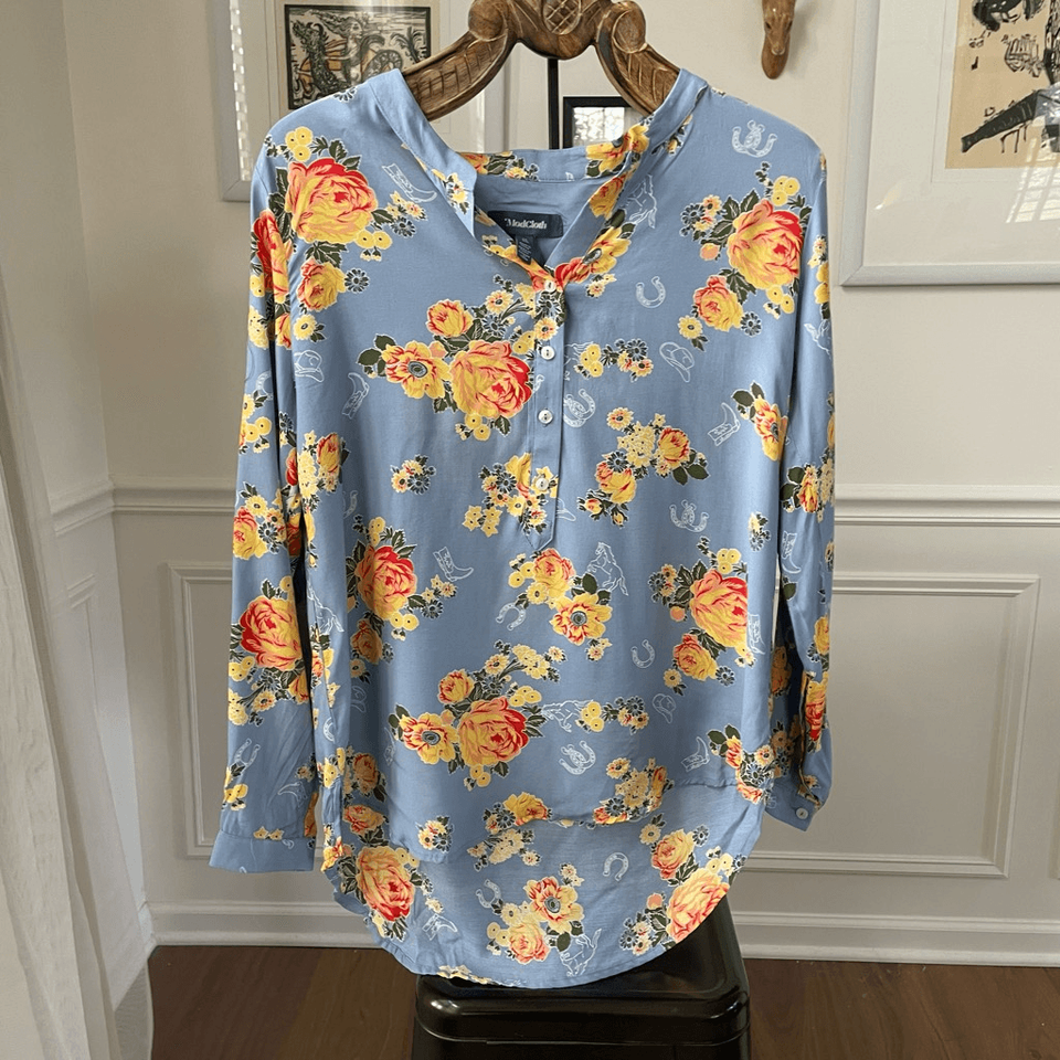 print, punctuated by horses, horseshoes, cowboy hats, and cowboy boots in white outline. Southwestern western country theme in viscose and rayon blend. Pop over style with band collar, V-neck opening before a four button placket. Hangs on longer in the back in the front. Laying flat measures 27 inches shoulder to hem with an additional 2 1/2 inches in the back, and 20.5 inches armpit to armpit.