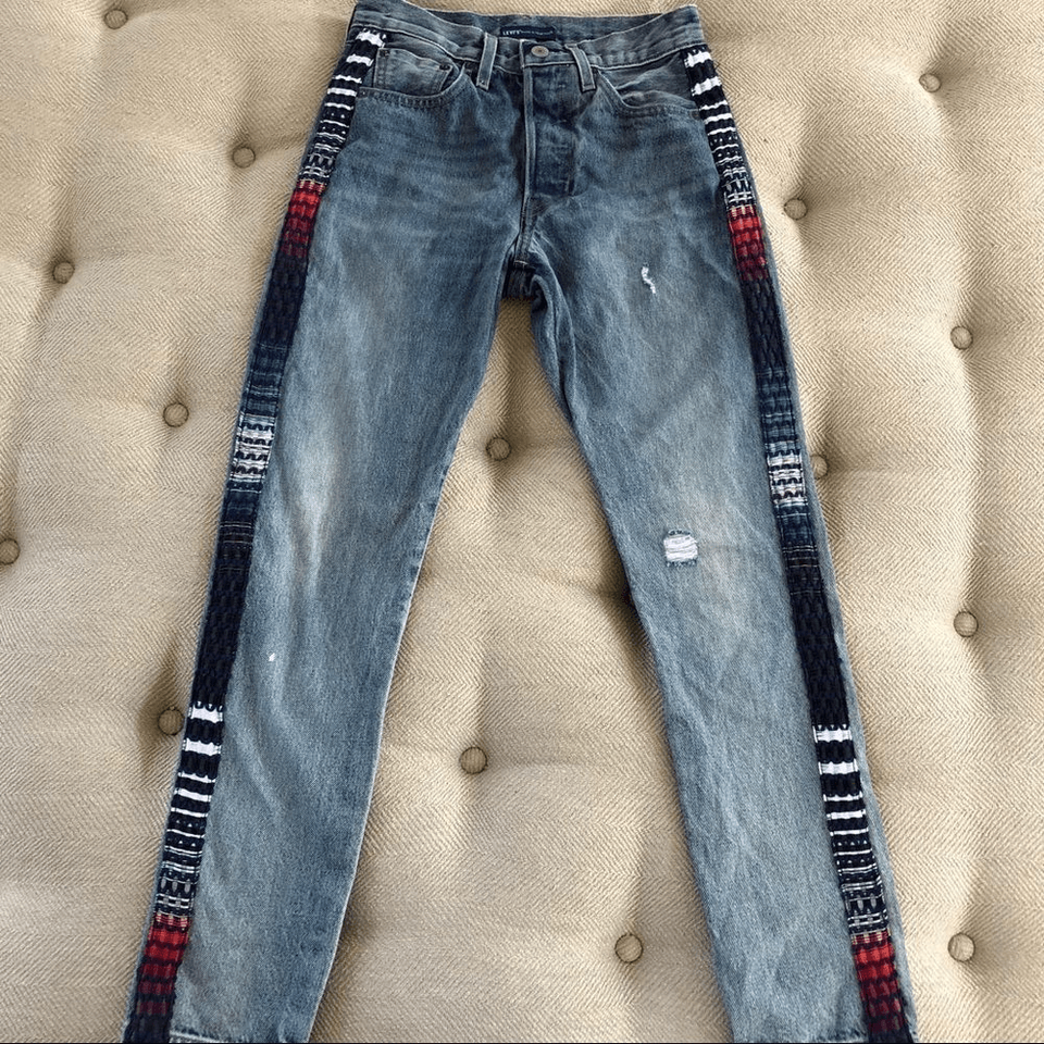 New without tags Levi?s Made and Crafted 501 skinny Selvedge jeans constructed from French heirloom fabric and embroidered with multi color serape style striping up the side. 28 inch inseam. 11.5 inch rise and measures 12 inches straight across the waist. Button fly.