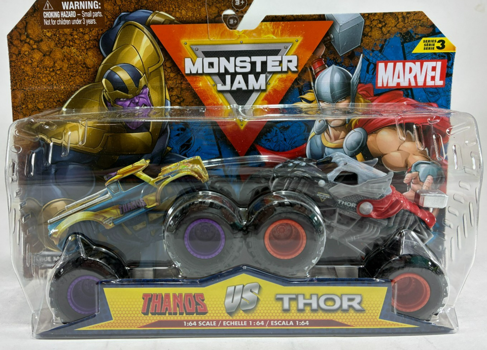 2 MARVEL MONSTER JAM TRUCKS: Bring Marvel's battles to the Monster Jam arena with the 1:64 scale die-cast 2-Pack Captain America Vs. Black Panther, Thanos Vs. Thor?ultimate matchups ready to clash