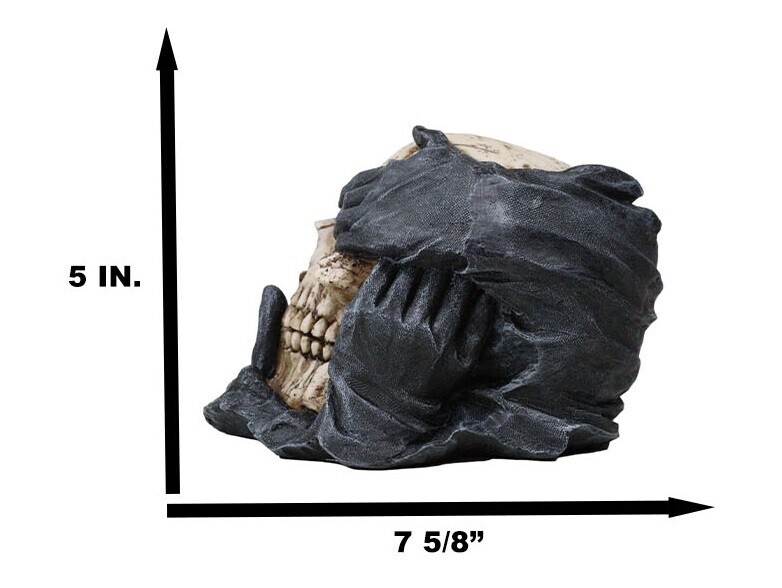 ? This Hear, See Speak No Evil Skull figurine is 5" tall, 7.5" long, and 6" wide approximately. It weighs about 1.25 pounds.