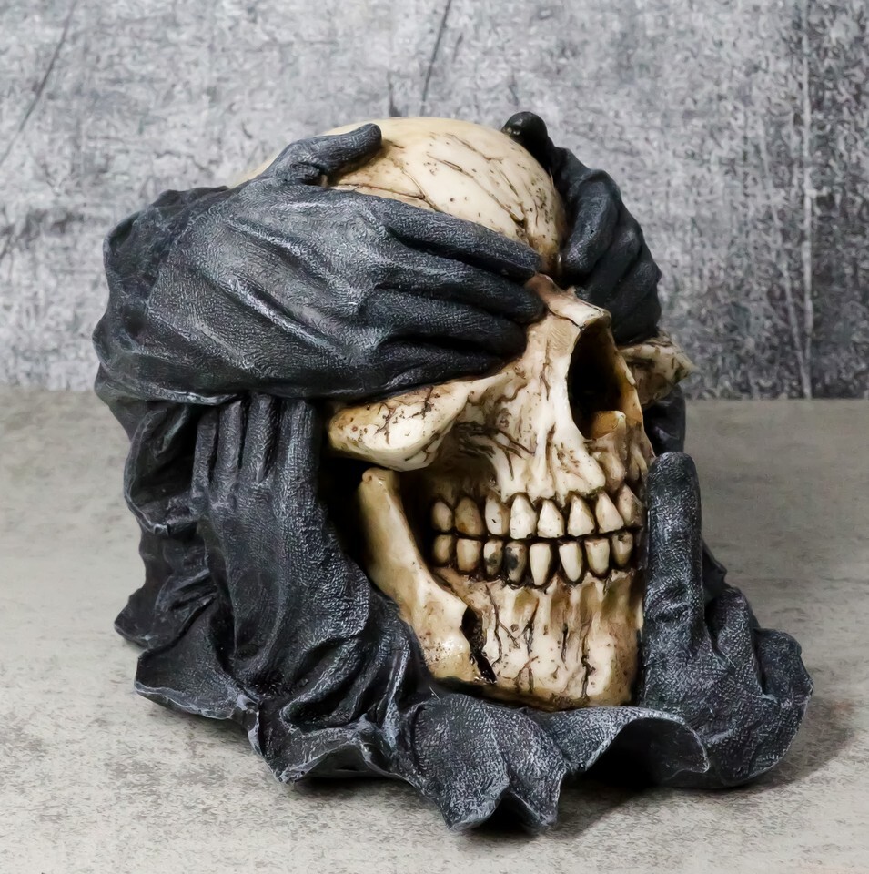 ? A deathly, decaying spin on a well-known phrase. All at once, we are gagged, blinded and deafened by the bleakness of death as it looms ever-present. We must not speak of evil, but we are ready to shout out loud about this grim design. Highly detailed, hand-painted decorative resin sculpture - perfect for use in your office as a rock and roll paperweight, or as a purely ornamental object to brighten up your home.