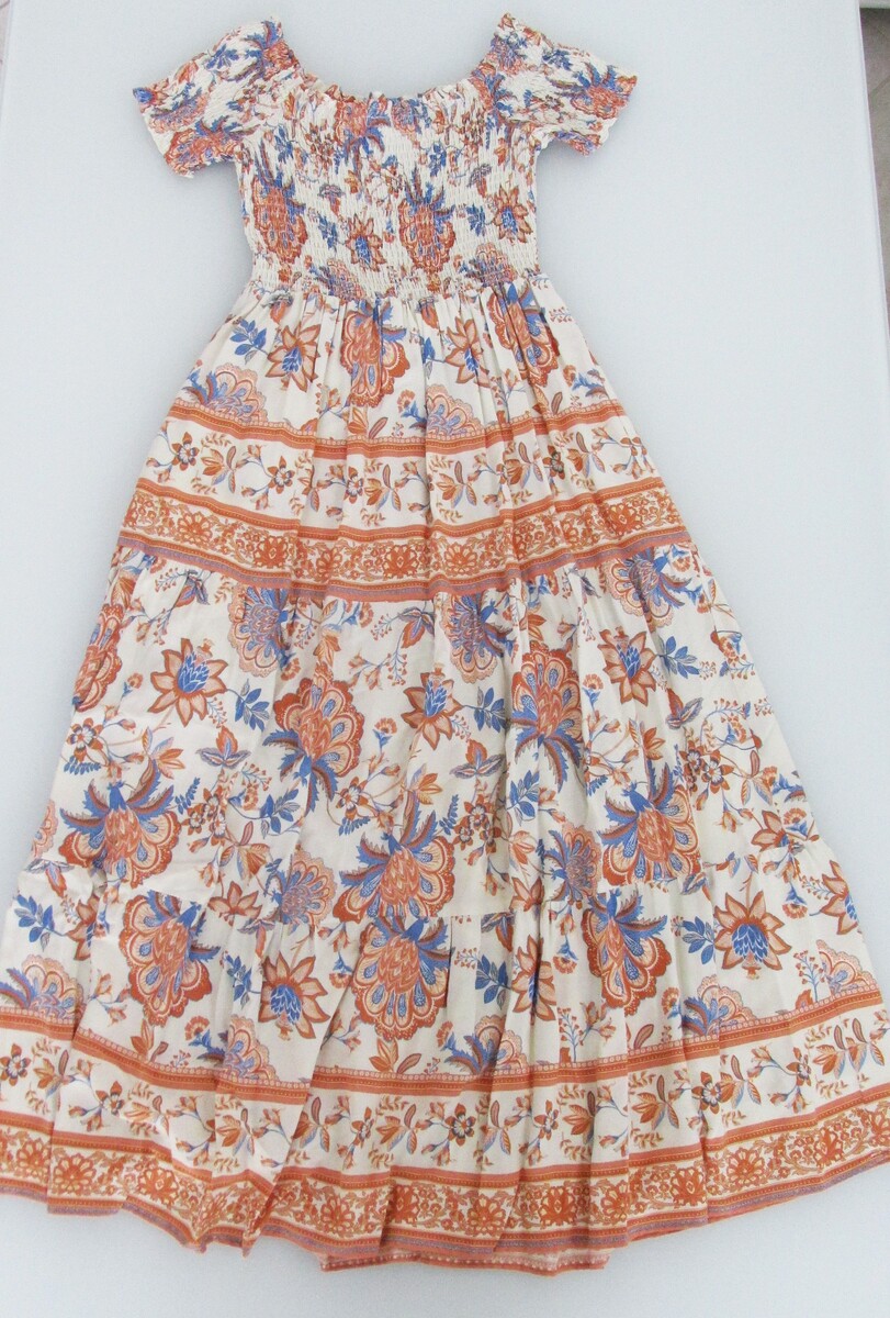 Description: Up for sale is an Entro women's midi dress. The size is medium. This dress is made of 100% rayon fabric and is fully lined. This short sleeve dress has a multicolored floral pattern orange, blue ivory. The dress features a fully elasticized upper bodice and sleeves. This dress is in perfect condition.