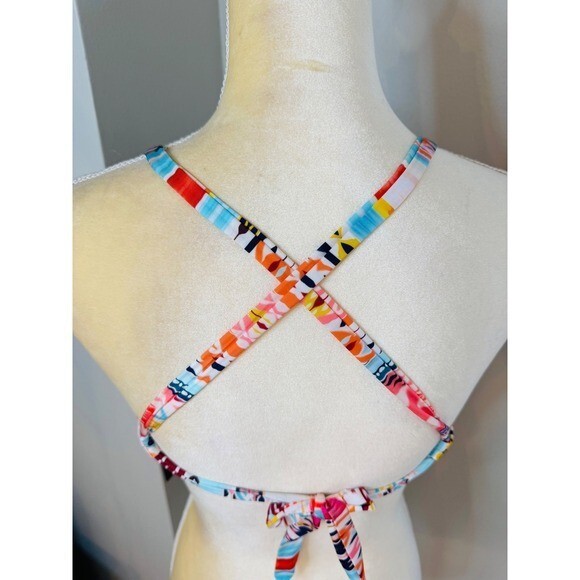 A bold pattern calls attention to a classic triangle bikini top fashioned with an adjustable tie in back.