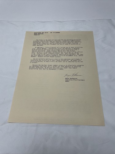 Up for grabs is a lot of 5 letters to all of the McDonnell Douglas Missile Systems Company (MDMSC) Teammates. These letters are congratulating the team for different contracts that have been awarded to them. One of the letters shows the restructuring of the company and the positions. It is titled "Dual Career Ladders Established" and shows the grade and positions. Another letter gives the Defining Concept of the New Missile System. The letters include congratulations for the following contracts: