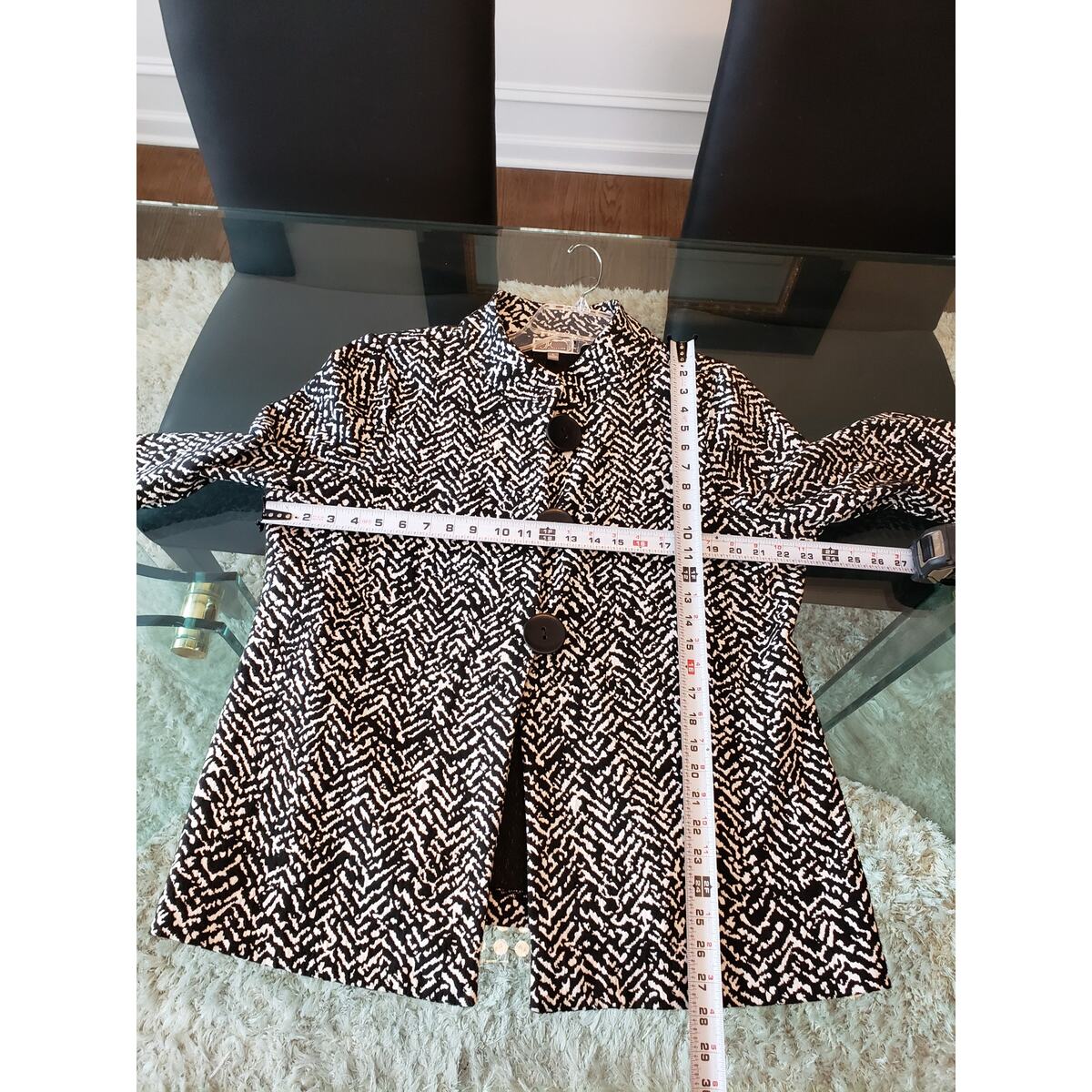 Make a bold impression with this JM Collection women's jacket in size L. Featuring a black and white textured pattern, oversized buttons, and a midweight stretch blend, this stylish coat is perfect for layering in cooler months. Its high neckline and structured cut deliver both warmth and elegance.