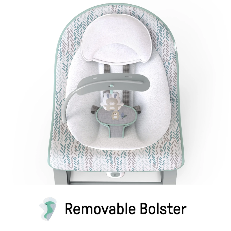 The Ingenuity Keep Cozy Baby Bouncer, Rocker Toddler Seat has 3 modes for parent convenience and baby preference: bouncing, rocking, and stationary seat (kickstand at the rear of the chair Neutral unisex design blends with your home gives infants and toddlers up to 40 pounds a seat with the family; grow-with-me design ages up from 0-30 months Use the cozy infant bolster to give newborns extra support and comfort, easily remove the bolster when baby outgrows it. 2 reclining positions keep baby comfortable Soothing vibrations help to keep baby calm, includes 1 detachable plush bunny playtime toy for entertaining and to practice reaching and grasping; vibrations powered by 1 C battery (not included) Safe and convenient design, includes 5-point harness to keep baby secure. Machine washable seat pad and bolster for easy cleaning