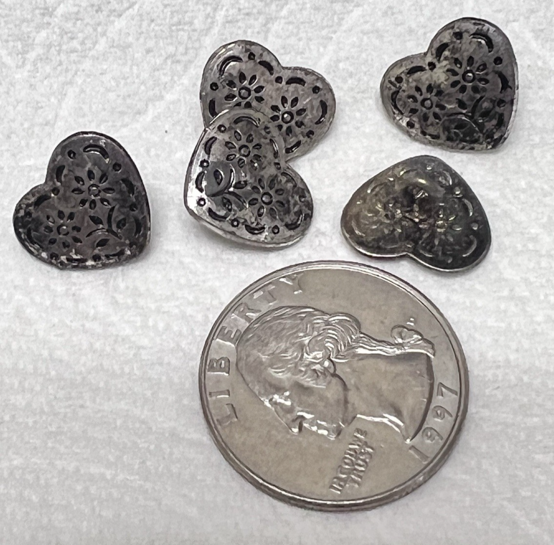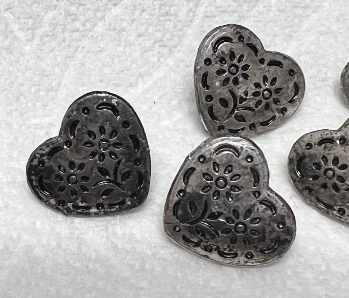 5 Vintage Silver Metal Buttons Hearts w Flowers Made in Austria 1/2 Inch In great shape they might polish but I'm not trying it