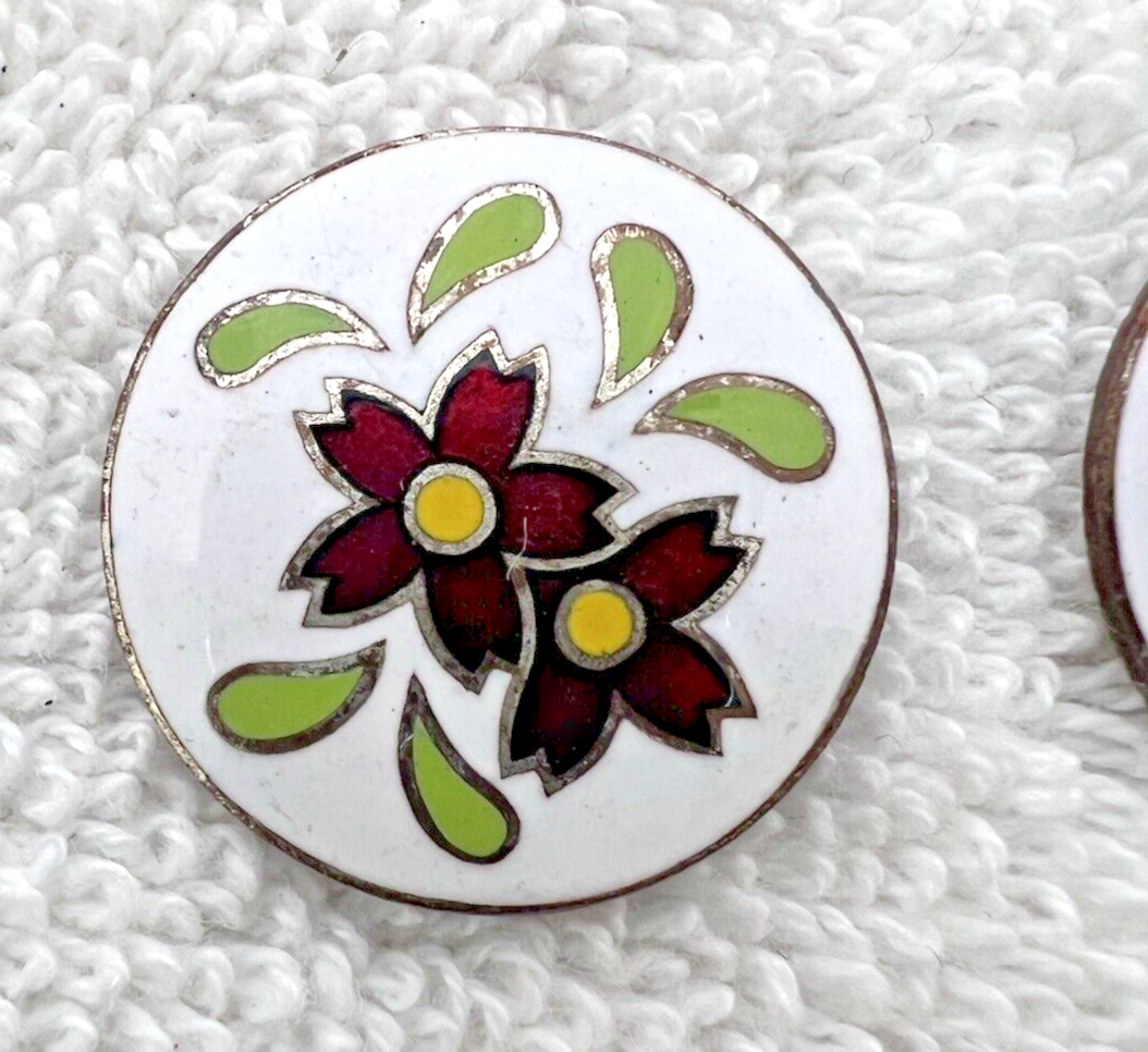 2 Vintage Red Flower Green Leaves on White Cloisonne Enamel Buttons 7/8 Inch you get 2 for the price both in great shape