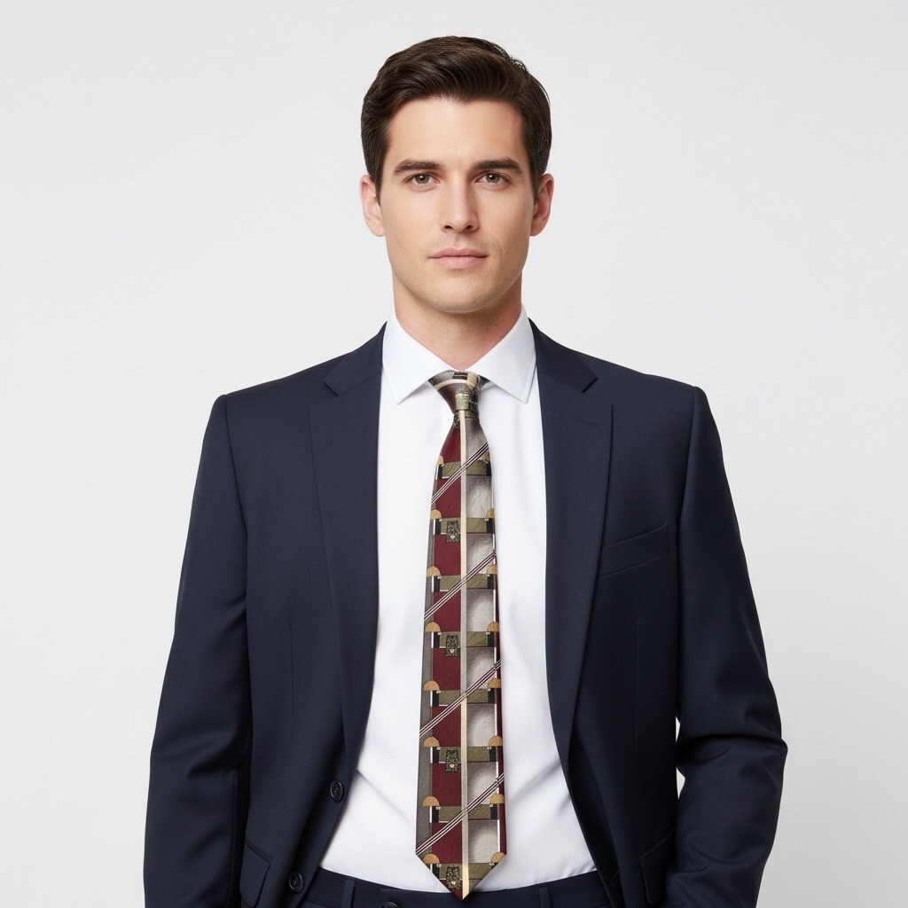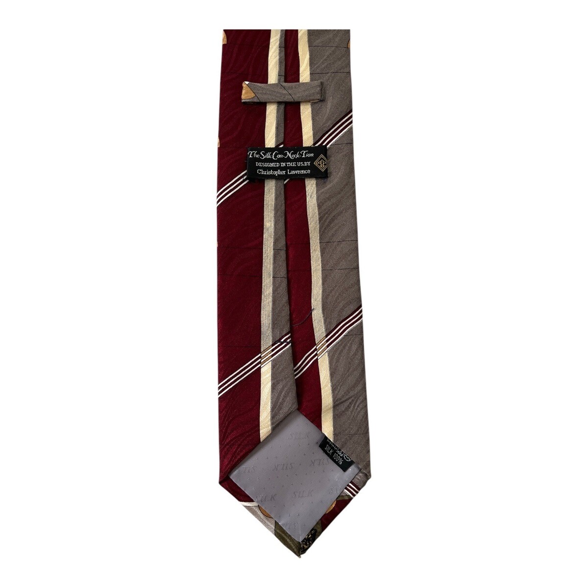 Vintage 100% silk necktie featuring a bold geometric block design in burgundy, gray, olive, and gold tones. Accented with diagonal striping and repeating heraldic crest motifs, this tie has a rich woven sheen and classic late-20th-century styling. Designed in the USA by Christopher Lawrence for The Silk Co., Neck-Tie division.