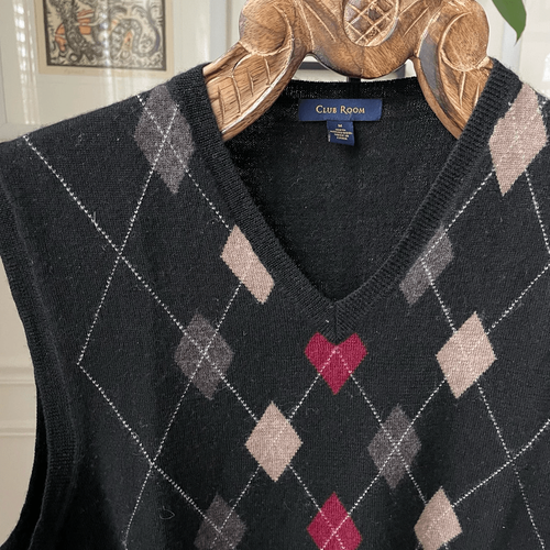 Clubroom brand men?s V-neck Argyle sweater vest made of 100% merino wool. Laying flat measures 25 inches shoulder to hem and 21 inches armpit to armpit. Black with Argyle in beige, burgundy and charcoal gray with white accents. My twin boys re-created the stepbrothers portrait for their senior pictures, so this was used once for photos and that is it.